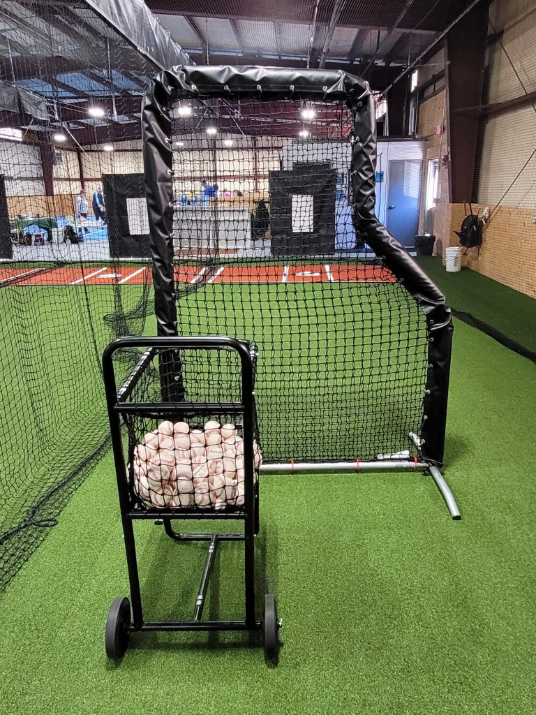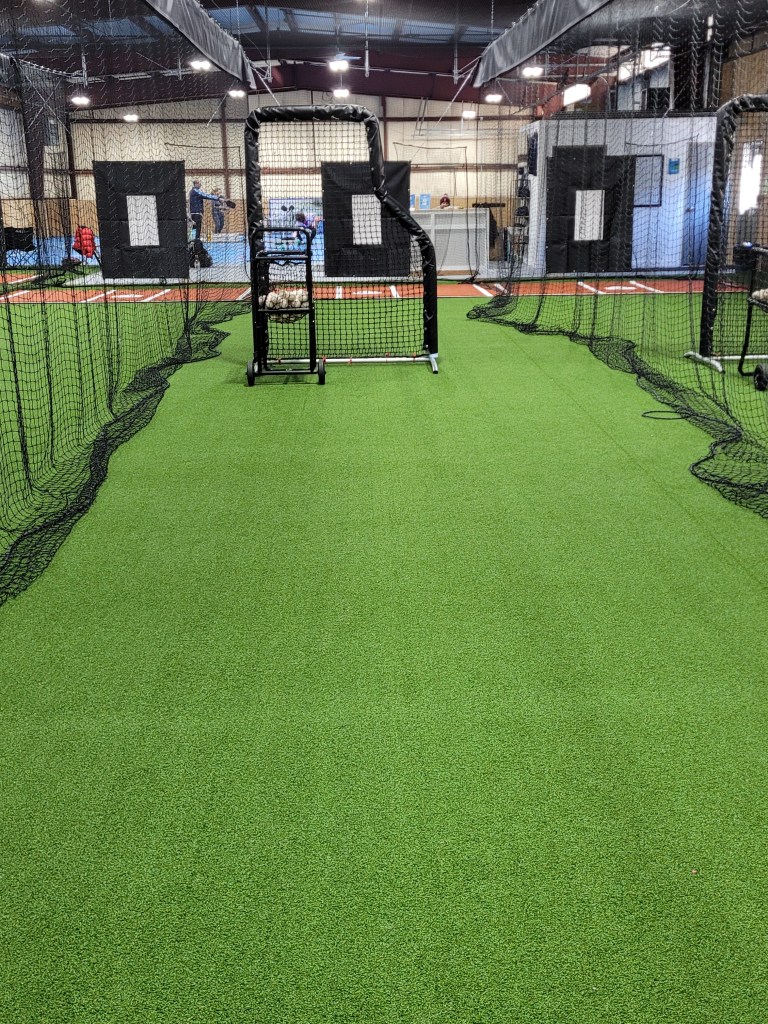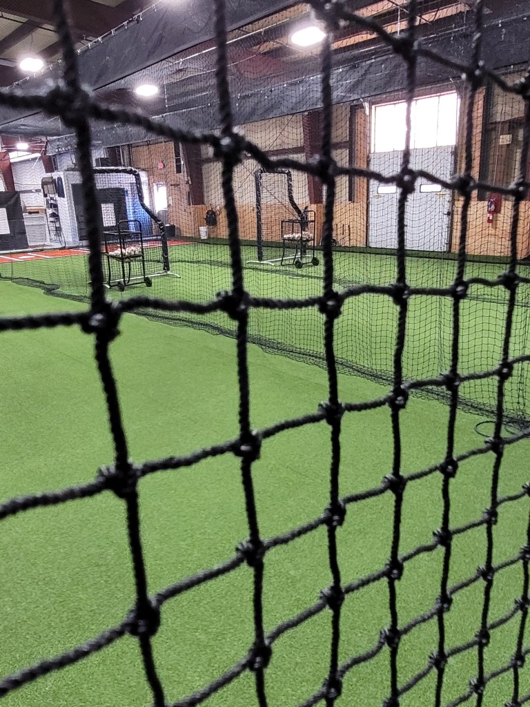 As Josh and I were speaking, I couldn’t help notice a Pickleball practice or gathering to the left of the front desk area. “Ocean State Pickleball is practicing and just passed the court (there) my team and I are working on a golf set up,” said Josh pointing to the area just passed the pickleball court. I asked him about if a multi sports facility was the original plan of Anchor Sports RI. “I wanted to focus on baseball and softball as well as blend in other sports and activities to make it a comprehensive, year round sports facility,” stated Josh, “but to be clear, the cages and baseball/softball programming was/is the main focus for sure.” Josh walked me over to the cages and we chatted about the setup. “3 60’s cages, 1 70′ cage there at the end, all netting is retractable if a team wanted to practice here.” Josh showed me the special kind of netting he had installed. “Take a look at this netting, the tension, the tautness of it,” he started, “we designed the cages with this higher rated golf netting set up so there is hardly any slack, no real chance of the balls flying into the net then coming down on top of a pitcher or another player, the ball just skips of the netting when it hits it. Very safe for hitters and batting practice pitchers standing behind those L-screens.” Josh mentioned a few resources he used for Anchor Sports RI. “78 Sports outfitted us with the netting, turf, sports related equipment. Ruggieri Carpet did the flooring and turf installation. And I used Martone to do the buildout and construction of the facility.”