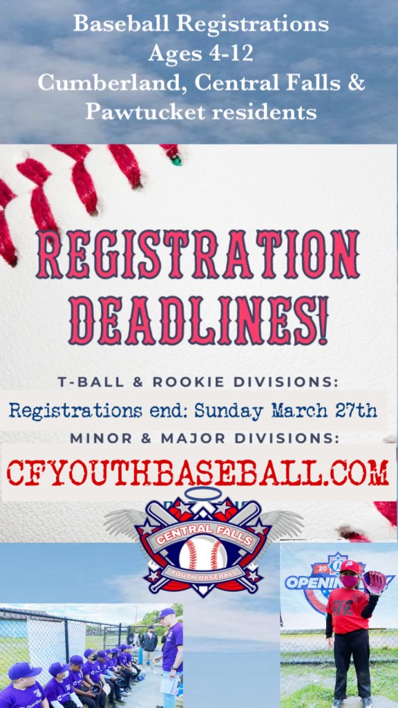 I received a very enthusiastic email from CF (Central Falls) Youth Baseball League President Thomas Evans last night. “My name is Thomas Evans, I am the President of Cal Ripken (ages 4-12) Youth Baseball here in the City of Central Falls. We are going on Year 2 and would love to share our registration information with your community. We are excited to bring baseball back to our city.” I love the community spirit and asked Thomas to send me the flyer and some information about the league. Below is the CF Youth Baseball League registration form. You can click on the photo to be redirected to the CF registration website: