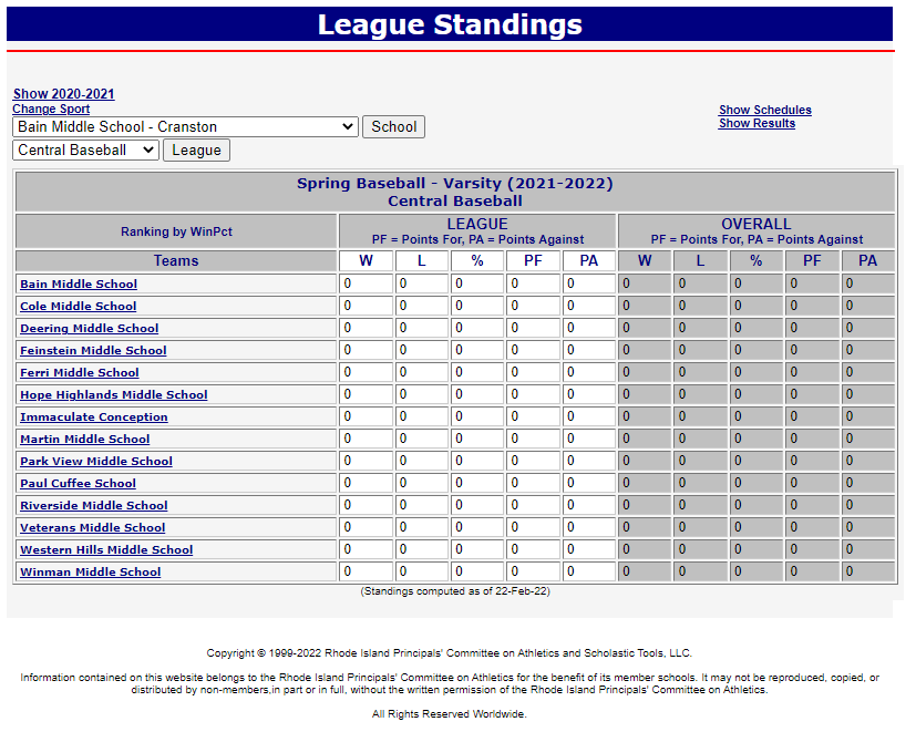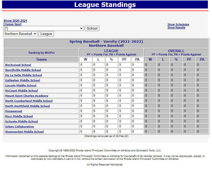 For those of you new to the RI Middle School Sports website, here is the link – RIPCOA – which provides updates on games, schedules, standings, rules, and everything you need to know about middle school sports. The baseball page has not been updated with game schedules as of yet (02/22/22). Here are the divisions that middle school baseball players will compete it.