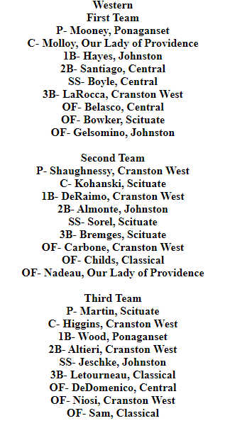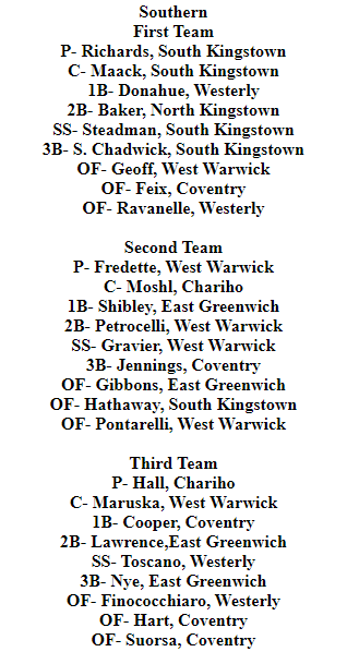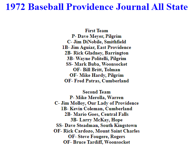 Also, according to www.rihssports.com, Politelli’s Pilgrim High School captured the Rhode Island State Baseball Title. Pilgrim was 10-2 in 1972, has a nice ring to it. It was Pilgrim’s 2nd title, having won their first 2 years earlier in 1970. And they were well represented in the All Division Team for the Central Division. Here are the All Division winners from 1972.