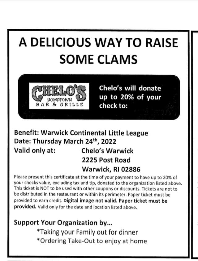 - Event – Take your family out for dinner or order take out at Warwick’s Chelo’s Hometown Bar & Grille