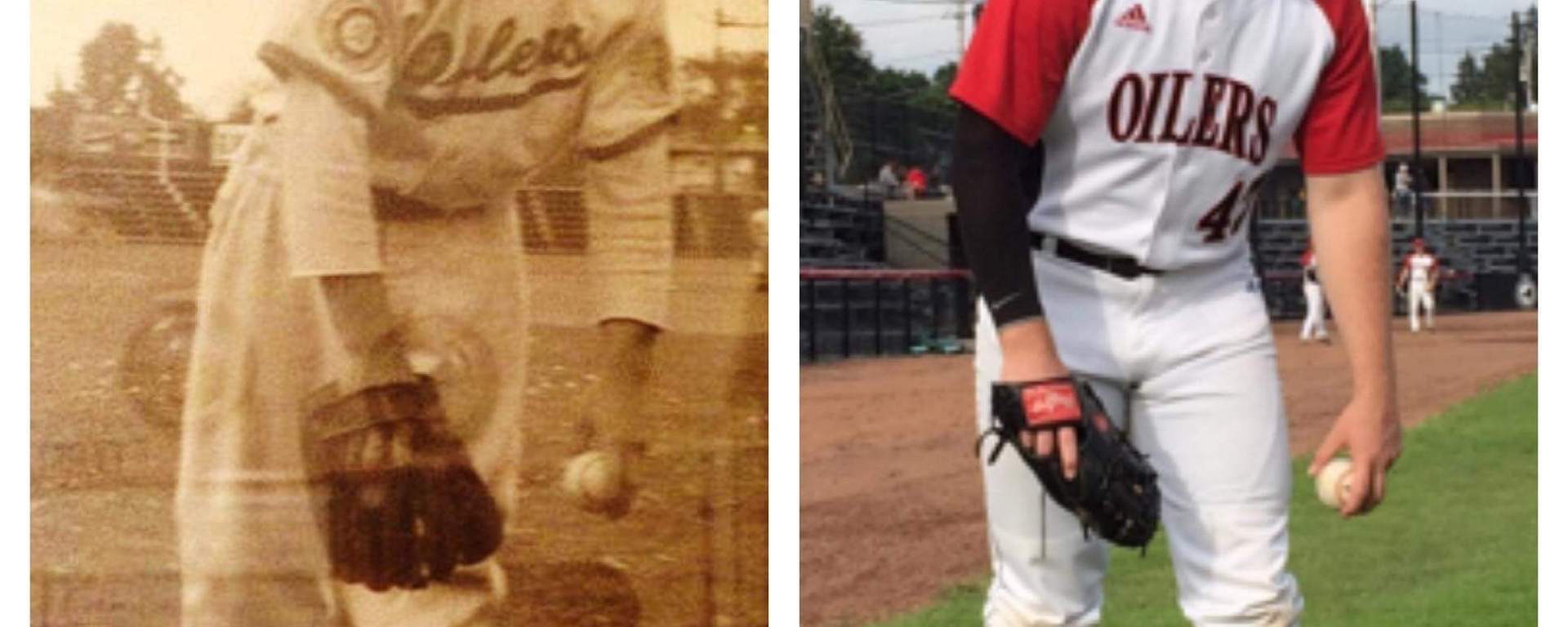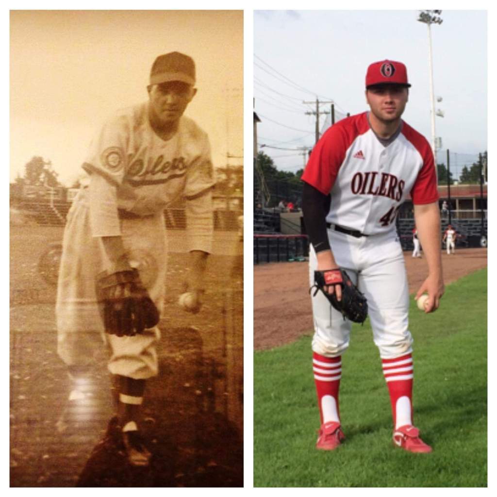 “This picture is of me and my grandfather side by side.. he played for the Oilers when they were a minor league team for the reds I believe.. kind of funny how i ended up in the same uniform 50 years later.”