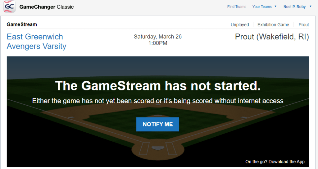 Got this notification from East Greenwich High School’s GameChanger App – EGHS vs Prout Scrimmage today at 1pm.
