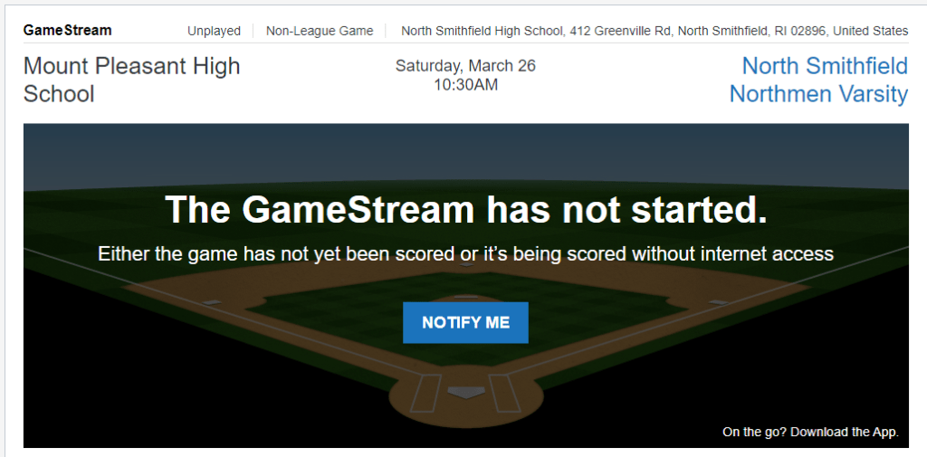 Got this notification from North Smithfield High School’s GameChanger App – North Smithfield vs Mount Pleasant Scrimmage today at 10:30am.
