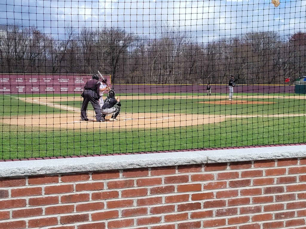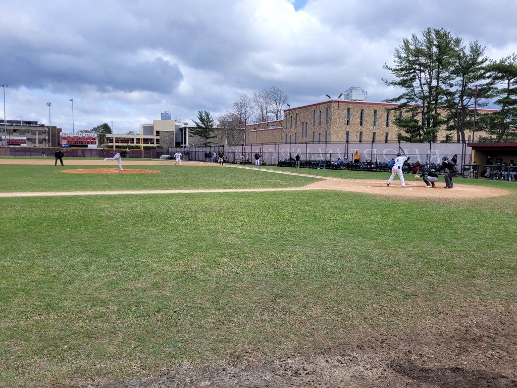 The weather was iffy and very windy to say the least as I drove up from North Kingstown, took 295 West to Route 6 then Killingly St, through Johnston, into North Providence, through Fruit Hill, then right into the campus of Rhode Island College. There were college tours going on all around the campus (which I will highlight later) and there was a lot of activity around the parking lot leading up to Pontarelli Field. Rachel and I arrived just as the starting lineups were being announced and found a spot in the bleachers just to the left of the visitor’s dugout. The national anthem was played as the wind tried its very best to rip the American Flag off its mast in centerfield. And then it was game time. First pitch was just after 12:10pm.