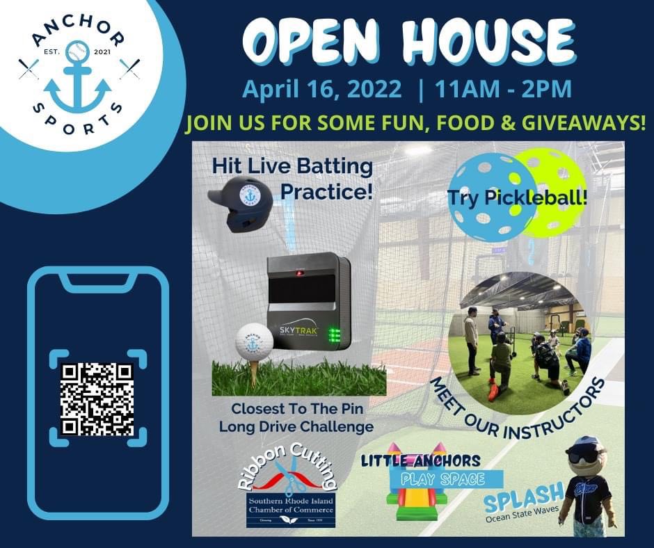 “Anchor Sports will be having an #OPENHOUSE on Saturday, April 16th (11am -2pm). So join us for FUN, FOOD & GIVEAWAYS!!! Hit #LIVEBP. Try #Pickleball, #LongDriveContest & Closest to the pin in our Golf Experience, MEET OUR INSTRUCTORS, play space for #LittleAnchors will be set up also. There will be a visit by SPLASH from the @oceanstatewaves with some gear to giveaway and a ribbon cutting by @srichamber – Don’t miss out and come visit Anchor Sports – 217 Church Street, Wakefield, Rhode Island.”