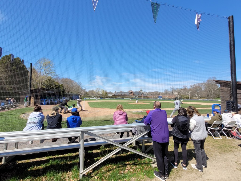 April 17, 2021 – I attended, with permission from the Salve Regina Sports Information Department, a home game at Salve Regina University’s Reynolds Field. The country, at that point in history, was in the early stages of opening up events, like college baseball games, safely to the public and Salve Regina’s campus was no exception. The streets surrounding the field had signs posted that no fans were allowed inside the stone walls, near the bleachers, near the dugouts, near the players for either team. Fans were asked to respectfully gather behind the designated areas, across the street, and socially distant from the players and subsequently the experience of being at a baseball game. I remember talking to frustrated parents of some of the players out in the grassy area passed the portable fencing about their experience at the game. Mixed emotions is how I would describe most of their comments. To be truthful, there wasn’t really a good spot to watch the game and take photos, as I typically do. I even had these students shoot a photo of the game for me: