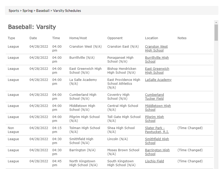 Yesterday, in Rhode Island collegiate baseball action, four teams with a ton of familiarity faced each other. Rhode Island College faced UMass-Dartmouth and Salve Regina hosted Roger Williams. All four college baseball teams feature players from Rhode Island who have played youth baseball, middle school, high school, travel ball, and showcase tournaments with or against each other for countless years growing up. It is always one of the more interesting notes I make at any college or amateur league game I attend – The Rhode Island baseball connection. And today’s Rhode Island Interscholastic League schedule of baseball games is taking this concept to a whole new level.