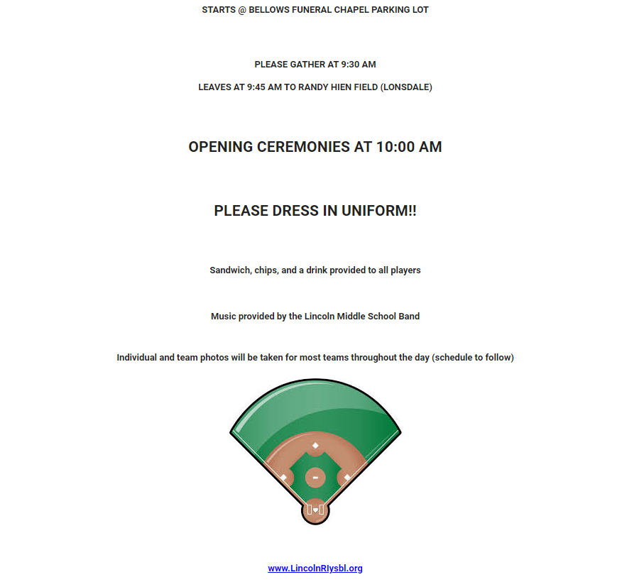 So, here is a quick recap. Lincoln Little League parade goers are asked to arrive around 9:30am at the Bellows Funeral Chapel parking lot. The parade starts around 9:45am and marches to iconic Randy Hien Field, which is located behind Lonsdale Elementary School. Players are encouraged to dress in their Lincoln Little League uniforms to march proudly down to the Opening Day Ceremony and Opening Day Celebration at Hien Field. Then, Opening Ceremonies begin around 10am with music provided by the Lincoln Middle School band. Individual and team photos will be taken throughout the day, Saturday.