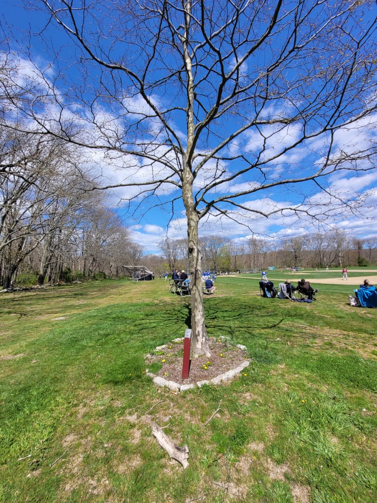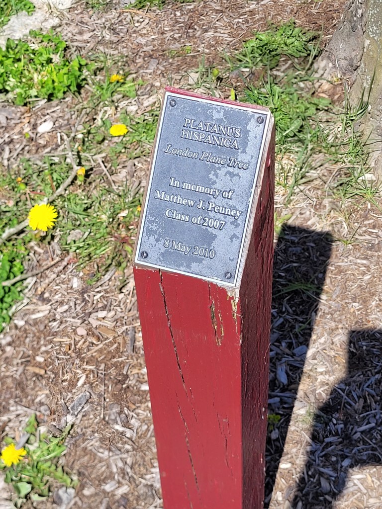 The Portsmouth Abbey Baseball field is located in the northwest corner of the campus, as Coach Gittus had described in instructions via email. I could be mistaken, but it looked as if the right field area was a bit more raised or on an incline compared to center and left field. As I walked down the right field foul area, there was a nice size gathering of fans in lawn chairs as well as a bleacher section. The temperatures were absolutely ideal for baseball – 60° and light breeze, patchy clouds, and a lot of sunshine. A stone wall formed the outer perimeter of the field, which bordered a lacrosse or soccer field to the left up a hill. Rachel pointed a plaque and a memorial tree as we were walking towards the bleacher section to watch the game. Here is the tree and the plaque which read, “In Memory of Matthew J Penney, Class of 2007.”