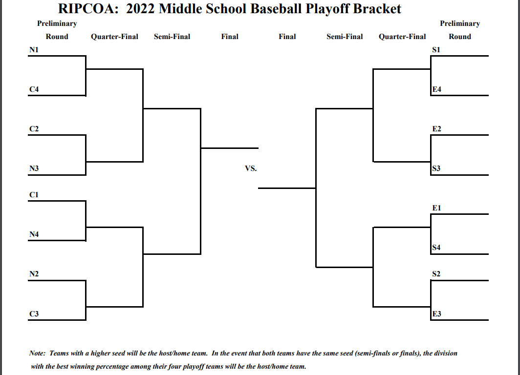 Based on the standings and reported games, it looks like there are a number of undefeated teams this year. Very cool!!! And now here is how the brackets and playoffs will look for the 2022 Rhode Island Middle School Baseball Tournament: