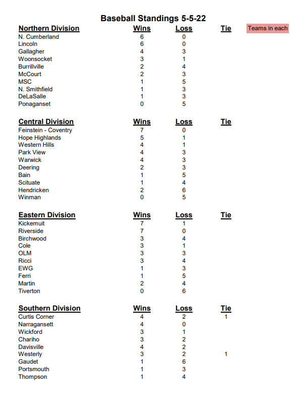 The Rhode Island Principal’s Committee On Athletics (RIPCOA) has a brand new website in 2022 and has recently updated their baseball page. This page includes the current schedule of games for the 4 Divisions (Northern, Eastern, Southern, Central) as well as the current standings (wins, losses as of May 5), and the upcoming playoff bracket (yet to be filled out). Based on the divisional schedules, the regular season for many schools is finishing up tomorrow, Thursday May 12th. Each Rhode Island Middle School Baseball team had a schedule of 9 games. However, in the case of weather delayed or postponed games, games can be made up and played up to May 18th, Wednesday, according to the RIPCOA Playoff Information link. Here are the standings (of schools that reported wins, losses to RIPCOA) as reported up to May 5th: