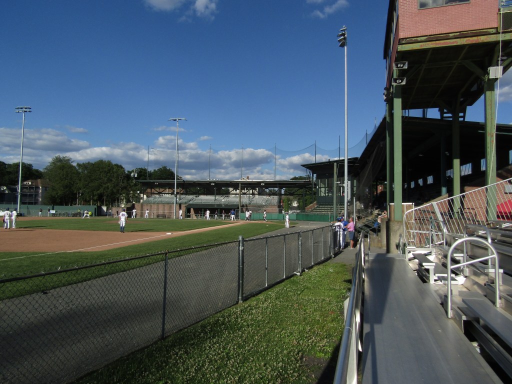Couple more notes on Muzzy Field. It was renovated in 2015 which included a new press box behind home plate, extended roofing over the 1st baseline bleachers. It also added a new fence in front of the dugouts for player safety and new lights. The field itself has a 320 foot right field, 405 foot center field and 341 foot left field and a new scoreboard was installed last year. The original wood benches in the 3rd baseline grandstand are still there, giving the park a really nice mix of the old and new, still preserving some of the history.