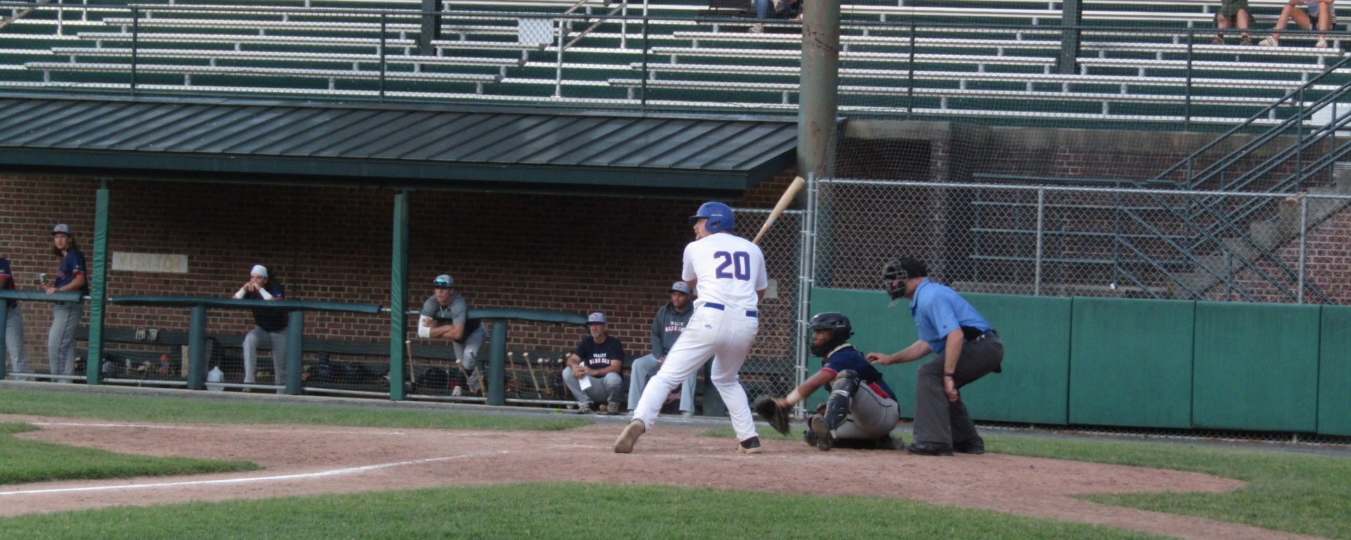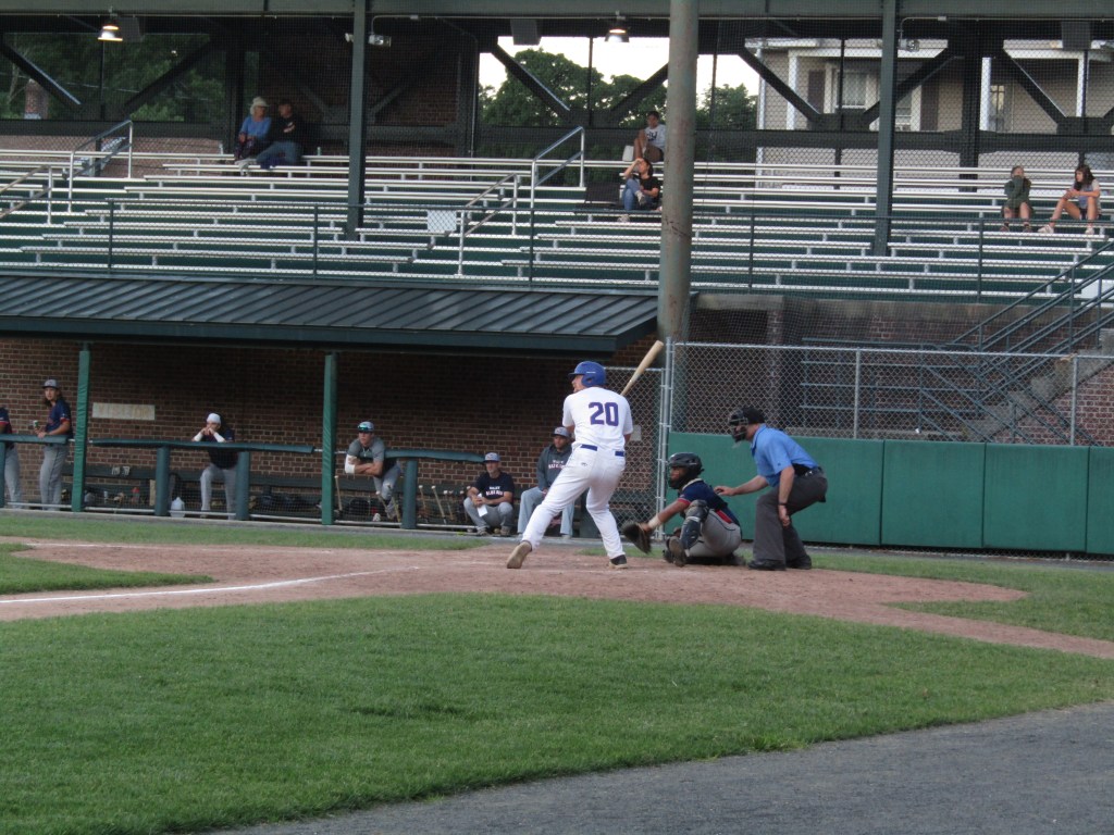 Once the first pitches were thrown and the anthem was sung it was time to play ball and from the moment the players took the field, the Blues fans filled the grandstand and were cheering non stop, even arguing bad calls. Throughout the game you could also hear the Blue’s bench and bullpen supporting and hyping up the players after great catches, bad pitches, and good plays. In the sixth inning I was taking photos of The Blues first baseman and Rhode Island native #20 Cal Parrillo (Johnston, Rhode Island College) while he was at bat. In the 6th inning, Parrillo stepped to the plate against a familiar opponent – his RIC teammate Andrew Sears (West Warwick, Rhode Island College). Sears had come into the game to pitch for the Valley Blue Sox in the top of the 5th inning. Parrillo hit a fly ball deep to left field that just made it over the glove and tried for second but was tagged out on a call that seemed like he could’ve been safe. Walking back to my seat, a father asked me if I got that series of events on video because all the Blues fans swore he was safe and he wanted to see the replay.