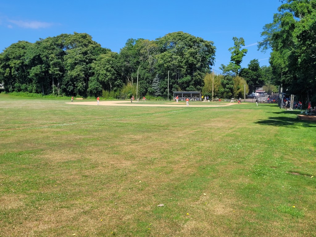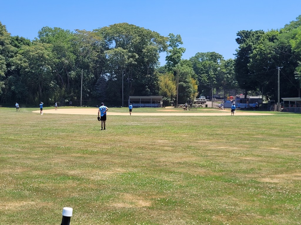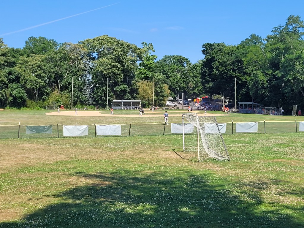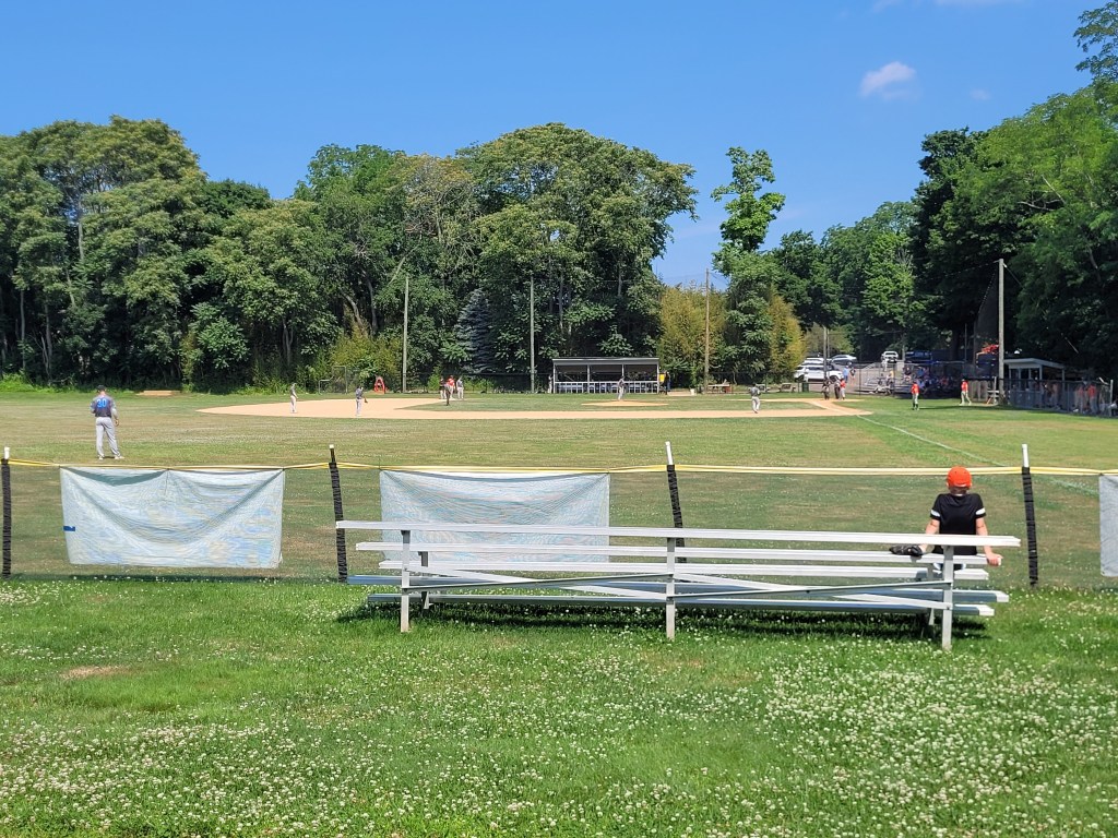 After a few innings, I made my way around the baseball field to get some other views and check out the landscape surrounding the field. First observation, Fiske Field is one of those great “Walk Up and Watch” type fields. The field almost invites you to come on down and check out a game. Bullpen mounds are designed like raised flower beds, one for each team on each side of the field. I’m going to use the term “farm stand” style for the dugouts because they looked like they were expertly crafted to look like a farm stand, with pitched roof and wooden benches inside. Fans could take up a spot on one of the picnic tables located around the perimeter of the field, like I did, or sit in the bleachers which were located behind home plate. Netting stretched passed the dugouts for safety and protection of foul balls. The outfield fence was lined with area sponsors. Field was in great shape for baseball. Concession stand was open and very busy. There were a few parking spots next to the concession stand or you could park across the street at the Shelter Island School. There are little walking paths all through the perimeter of the field that connect the main road to the field. I found a set of bleachers in right field with a ton of shade and sat there for an inning to watch the game. I took this video from my shady spot in right field.