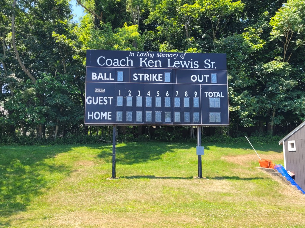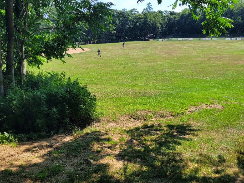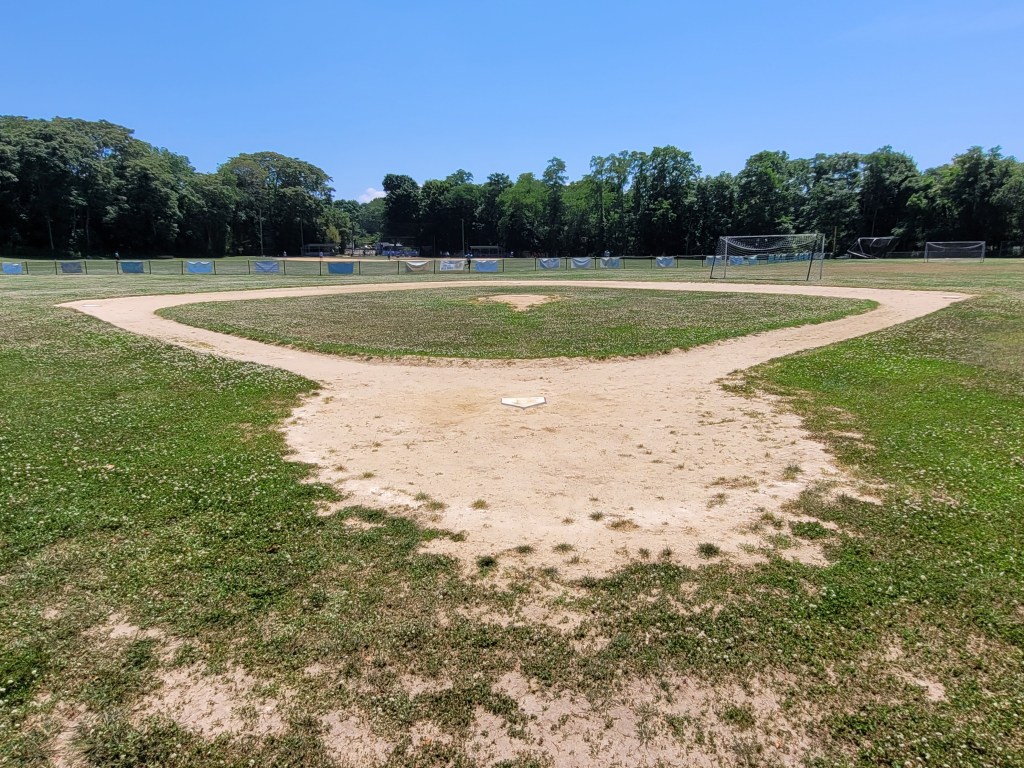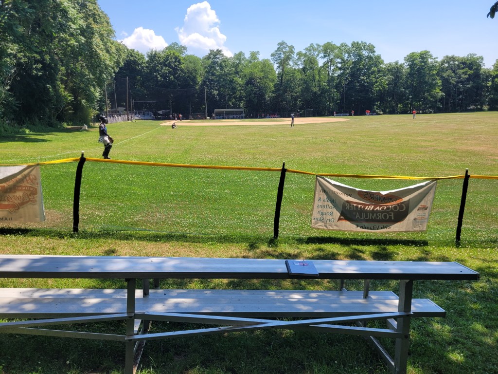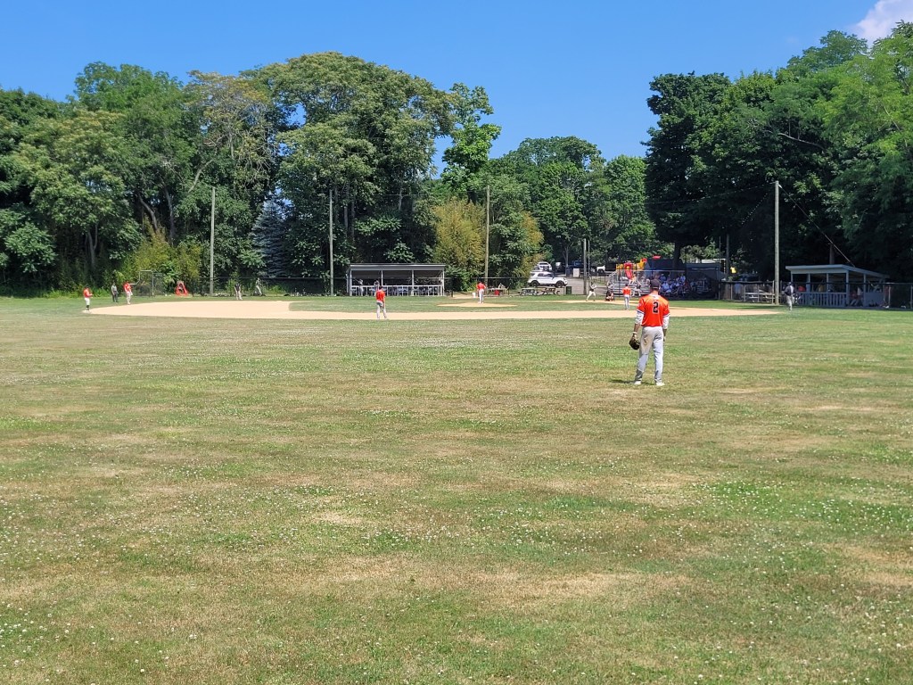 After a few innings, I made my way around the baseball field to get some other views and check out the landscape surrounding the field. First observation, Fiske Field is one of those great “Walk Up and Watch” type fields. The field almost invites you to come on down and check out a game. Bullpen mounds are designed like raised flower beds, one for each team on each side of the field. I’m going to use the term “farm stand” style for the dugouts because they looked like they were expertly crafted to look like a farm stand, with pitched roof and wooden benches inside. Fans could take up a spot on one of the picnic tables located around the perimeter of the field, like I did, or sit in the bleachers which were located behind home plate. Netting stretched passed the dugouts for safety and protection of foul balls. The outfield fence was lined with area sponsors. Field was in great shape for baseball. Concession stand was open and very busy. There were a few parking spots next to the concession stand or you could park across the street at the Shelter Island School. There are little walking paths all through the perimeter of the field that connect the main road to the field. I found a set of bleachers in right field with a ton of shade and sat there for an inning to watch the game. I took this video from my shady spot in right field.