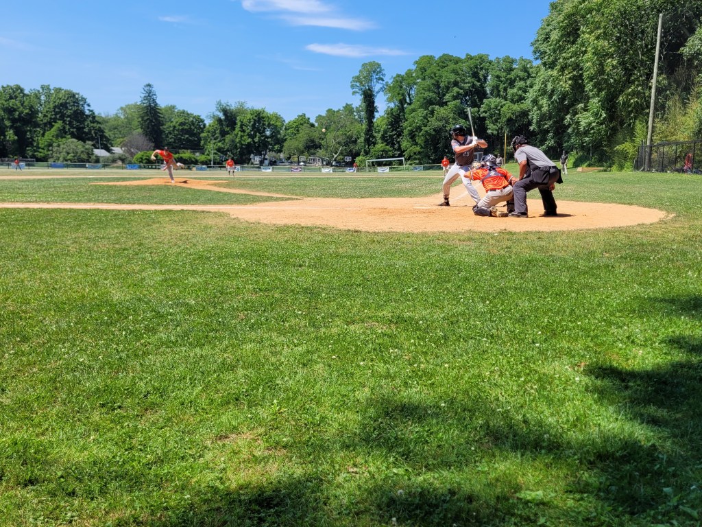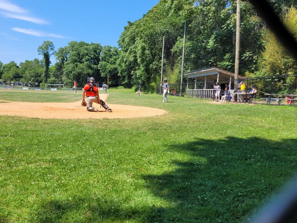For the first few innings, I parked myself on a picnic table right next to the Sag Harbor Whaler’s dugout. It was a great spot to watch the game and take photos. Not too much shade to speak of but great view of the field. And a once in a lifetime occurrence happened that I am happy to tell the tale of. Behind the Sag Harbor/first base dugout was a row of trees and some utility poles. A Sag Harbor batter fouled a ball off into those trees. It hit a tree branch, then another, then rolled on the ground about 20 feet, right to my right foot which was propped up against the backstop. I kid you not!!! It landed right next to my foot. I picked it up and handed it to a game attendant and laughed about the occurrence with the Sag Harbor media team, who also witnessed it. What an amazingly rare baseball occurrence that I will talk about for years and years to come!