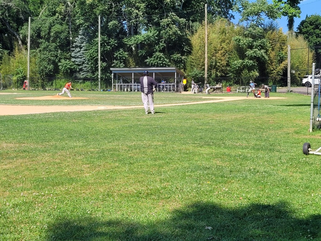 A few interesting game notes I jotted down. In Conor Kiely’s 2nd at bat, he flied out to deep center field to Cam Santerre – a Rhode Island connection that was cool to note, a positive one for Santerre, maybe not so much for Kiely. Kiely did get on base in his first AB in the 1st inning, with a walk and then scored. And as of Sunday, Conor is hitting a robust .364 for Shelter Island. On my way out to left field, I had the chance to meet Conor’s parents who had made the trip from Portsmouth on Sunday to watch their son and we chatted about the Rhode Island baseball connection and how cool that was. Nice family, very friendly. Sag Harbor’s Cam Santerre went 1 for 4 with an RBI and of course, 1 stolen base (he had 34 this year at RIC). The one hit, was off of Shelter Island’s Jon Jones, so a 2nd Rhode Island connection that went Cam’s way. Jones would pitch 1 1/3 innings on Sunday, striking out 2 batters. Jones, as of Sunday, is 2-0 for Shelter Island with a 3.37 ERA, 10 innings pitched, 14Ks – impressive.