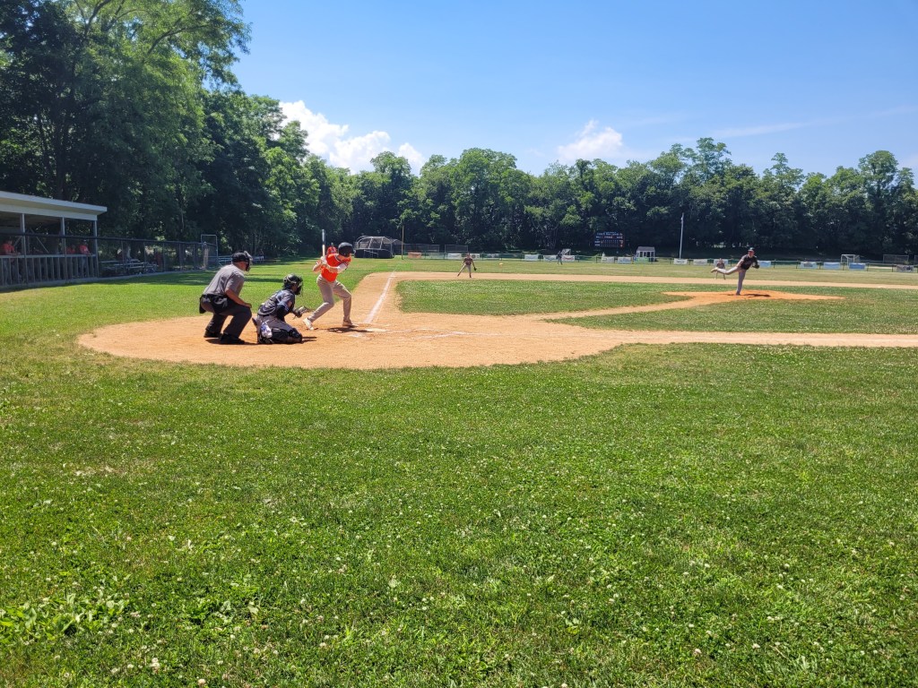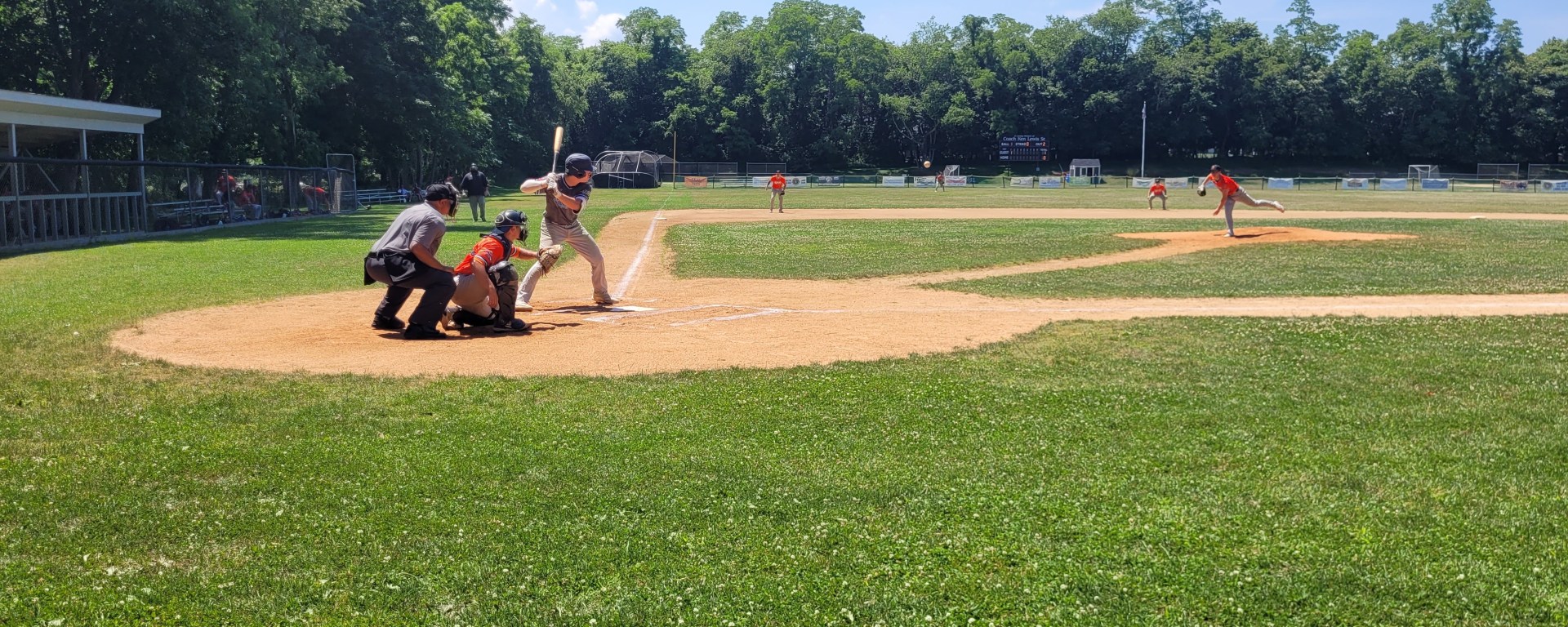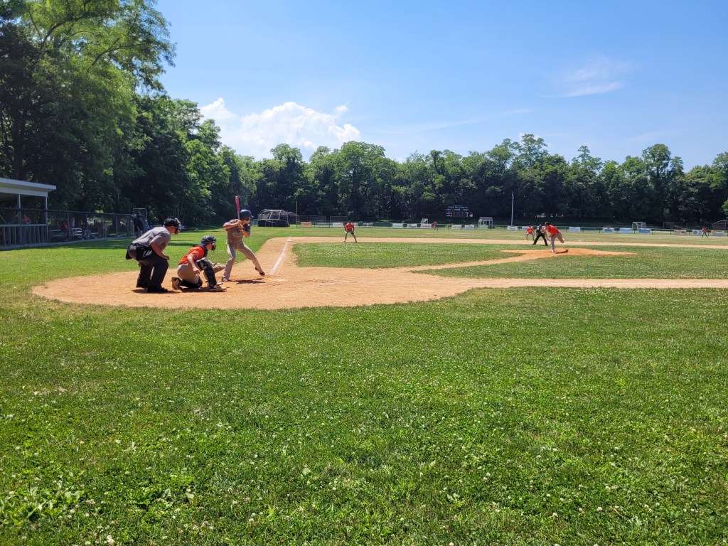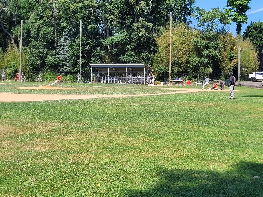 About 45 minutes before game time, Rachel and I and the Weims arrived at Fiske Field via Bateman Road. Fiske Field has several fields and a basketball court on the grounds, with the big field being occupied by the Sag Harbor Whalers and the Shelter Island Bucks on Sunday for a doubleheader (2pm and 4pm starts). As we parked and got the leashes on the dogs and stretched out our legs, the two Hamptons League teams were warming up, taking batting practice, and other pre-game routines. There was a good view of the field from our spot next to the basketball courts as well as a decent amount of shade. The two umpires for the game had parked two cars over from us and I asked them if they were calling both games. “Yup,” said the Game 1 home plate umpire, “and we are going to lose some weight in the process,” jokingly referring to the umpire’s gear he had on in addition to his long pants and buttoned up shirt. With temps soaring into the high 80s, I wished him well and told him to drink a lot of water today.