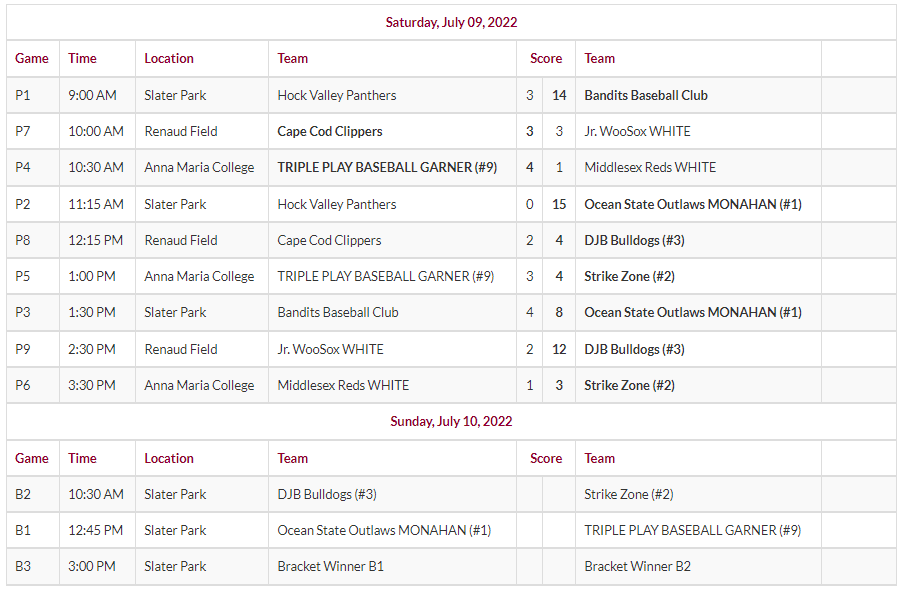 Busy day yesterday in the 2022 NEAAU 14U Super Division Playoffs. 4 Teams remain – DJB Bulldogs, Ocean State Outlaws (Monahan), Strike Zone, Triple Play Baseball Garner. Semifinals and Finals are being played this morning at Slater Park, Pawtucket. Good luck DJB and Outlaws players, coaches, and families today!!!