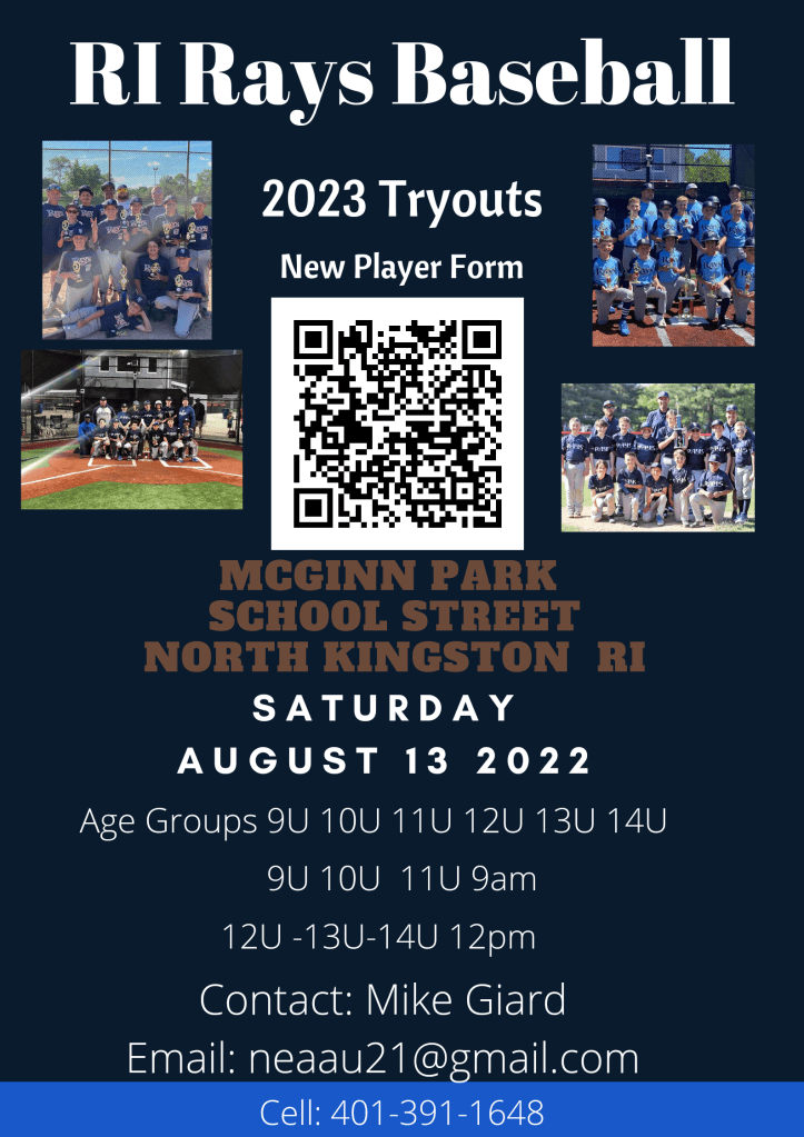 Getting a ton of tryout information for AAU, Travel, and Showcase Tournament teams for 2023. I will post them all on my social media pages as soon as I get them in. Here is one for the RI Rays Baseball Club, that will be held in North Kingstown on Saturday August 13th. Click on the QR code for further details.