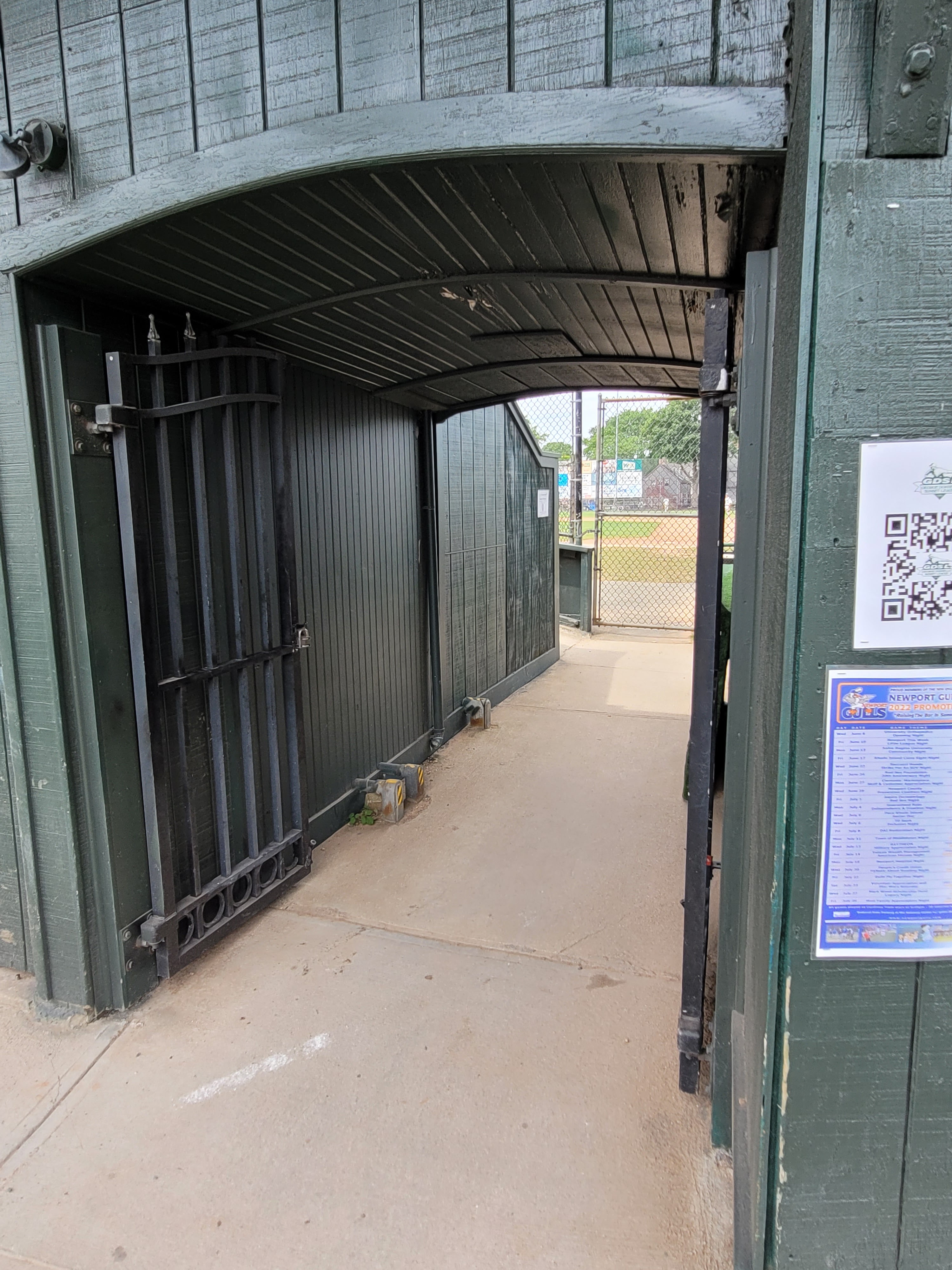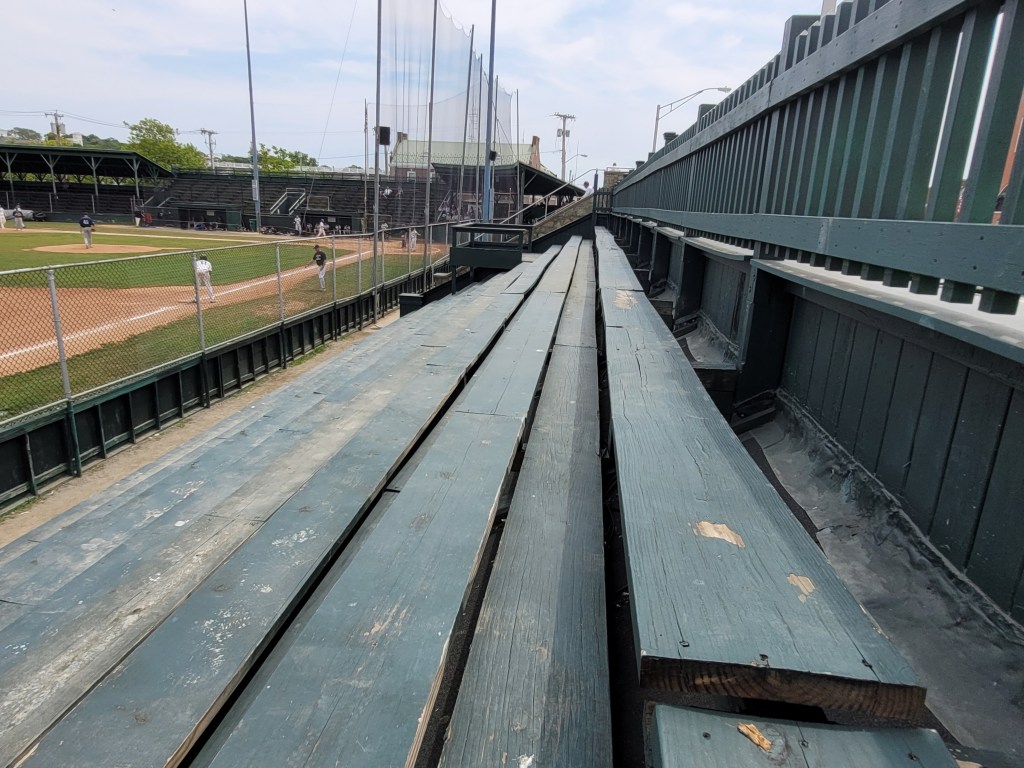 Okay, after a nod to Chris, I made my way through the press box and up to the corner of the right field bleachers. I remember one afternoon during the Covid and attending the one time only Newport Collegiate Baseball League season, players were sitting in those right field stands with their gear. On Saturday, I had a nice view of the field and snapped a few photos from the right field corner bleachers. These seats give you a direct view of the hockey style dugouts with the two teams sitting side by side on the first base side of the field.