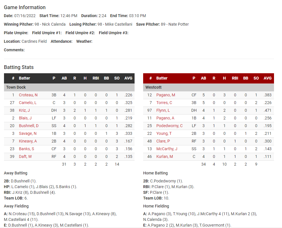 And here is a snapshot of the box score featuring the Town Dock and Westcott lineups on Saturday, courtesy of the official website of the George Donnelly Sunset League – www.gdsunsetleague.com.