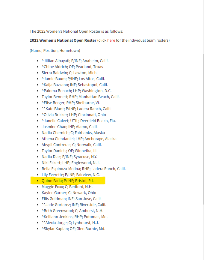 Who made the roster? Okay, this was something I have to check out. Perhaps, a Rhode Island player was invited to participate in this incredible opportunity to showcase their talents and become part of the Women’s National Team. So, I clicked on the link and found this and took a snapshot of the roster (and highlighted the lone representative from RI):