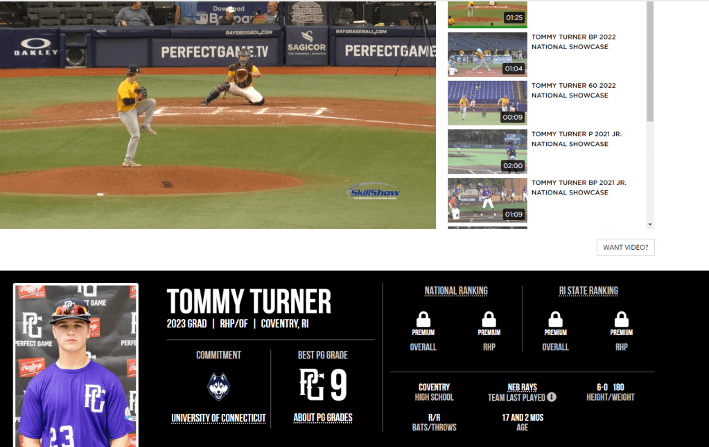 So, if you are a high school player in the United States and you are selected as one of 500 players to fly to Tampa, FL and compete in a Perfect Game (PG) National Showcase event, I would say you are one of the 1% elite baseball players in the USA. To be fair, 500 players selected out of a possible 400,000 players puts your stock at even greater than the 1% elite. You are the elite of the elite, I would say. Of the 500 players selected to compete in this summer’s PG National Showcase event, two Rhode Island players (both pitchers) were selected and attended the showcase – Coventry High School’s Tommy Turner and Bishop Hendricken High School’s Alex Clemmey. Here are their profile pages from the event, which took place last week. Click on the caption link below each snapshot to watch videos and read more about these elite players from Rhode Island!!!
