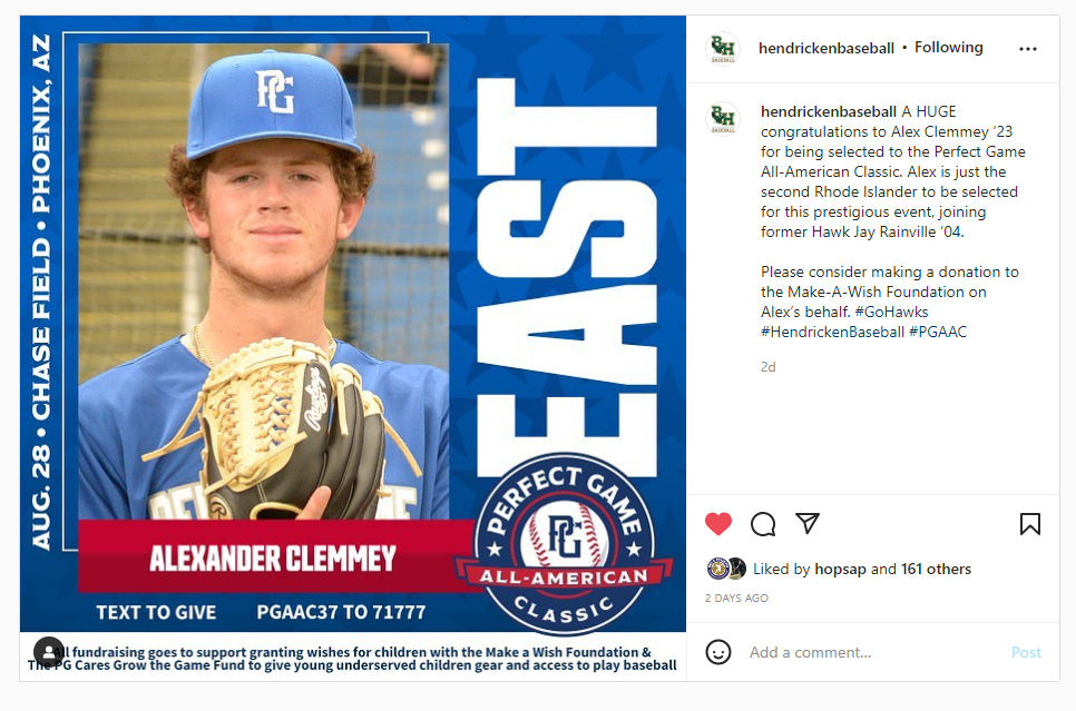 Absolutely amazing news and congratulations to Alex and his family on this prestigious honor and accomplishment. I read the post and the caption and noticed that a donation page was set up to support the Make A Wish Foundation and the PG Cares Grow the Game Fund. To quote the Hendricken IG post, “Text to Give – PGAAC37 to 71777,” to make a donation. According to The PG Grow the Game fund page, “Perfect Game has been the leader in growing the game of baseball in all ages, in all ways. In 2021, Perfect Game Cares launched a program dedicated to providing opportunities for baseball and softball players from the many underserved and at-risk communities across America.” The fund provides: