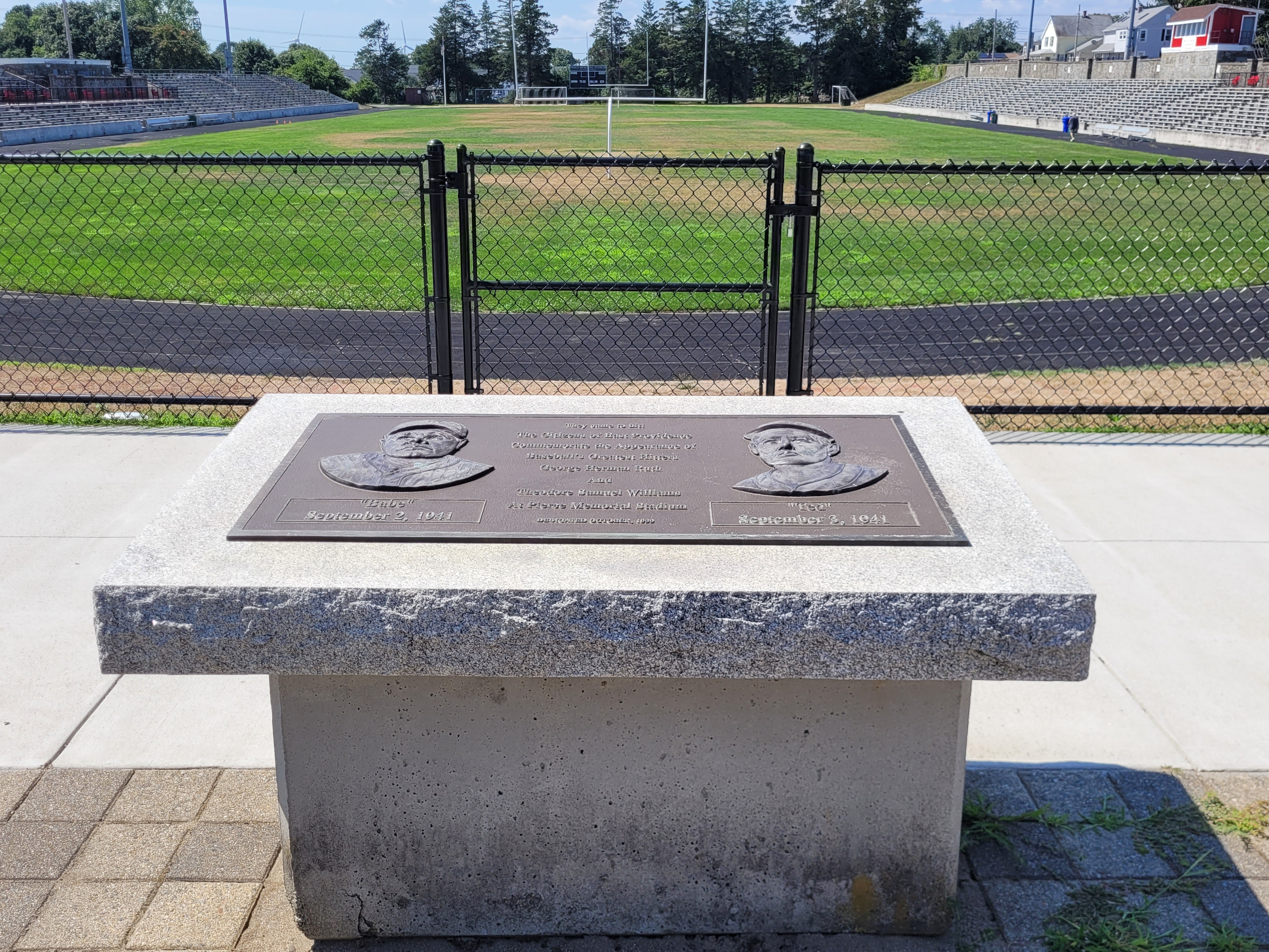 More water, the search for a Band-Aid for a young fielder, and another loop around the fields put us back at the garage at Pierce. I asked Bobby what was the most Townie thing at this camp or at this field. He mentioned the “Pond Effect” which some have claimed robbed them of home runs due to the winds blowing in off the water. “Not true,” states Coach Rodericks, “the wind is really coming in from the ocean, which you can see on your drive in or out of this area of East Providence.” Coach Duvall chimed in his thoughts. “What about the Babe Ruth and Ted Williams sightings at Pierce Stadium?” The what? I said and with that Coach Rodericks and I sped off on the golf cart to the football stadium next to the baseball field. “I bring all my players over here to check this out,” said Bobby as he pointed to the plaque commemorating the appearances of Hall of Fame legends Babe Ruth and Ted Williams at Pierce Memorial Field, circa 1941. A very cool experience and here is the plaque: