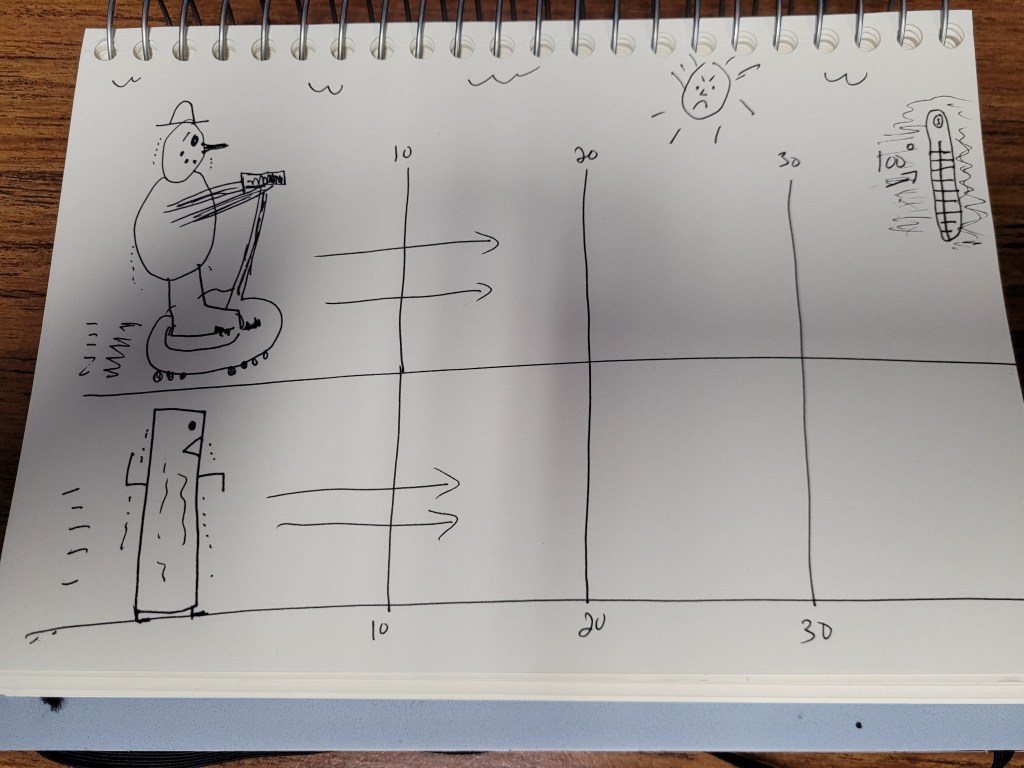On a scorching hot 100° August afternoon, with the sun was as angry as it was bright, two unlikely participants met for a 30 yard race. Lenny the Snowman, a distant relative of the famed Frosty family of SnowPeople, faced off against Stick of Butterman, who accepted Lenny’s challenge despite the backlash from local Chef Antonio from River’s Café. Lenny was allowed to use a modified Segway scooter, top speed 10.4 mph, outfitted by two titanium L-brackets for legs, of which Lenny plopped his lower half onto to appear like he was standing upright. Stick allowed the modification only if he, Stick of Butterman, could pick the race location – Evans Fieldhouse, where nearly full grown arborvitae lined the track providing just the right amount of shade for a runner in Lane 1. The stage was set, the racers were ready with sweat pouring off them from the second they arrive, the conditions were hot and uncomfortable for two unlikely racers on a hot and sunny August afternoon.