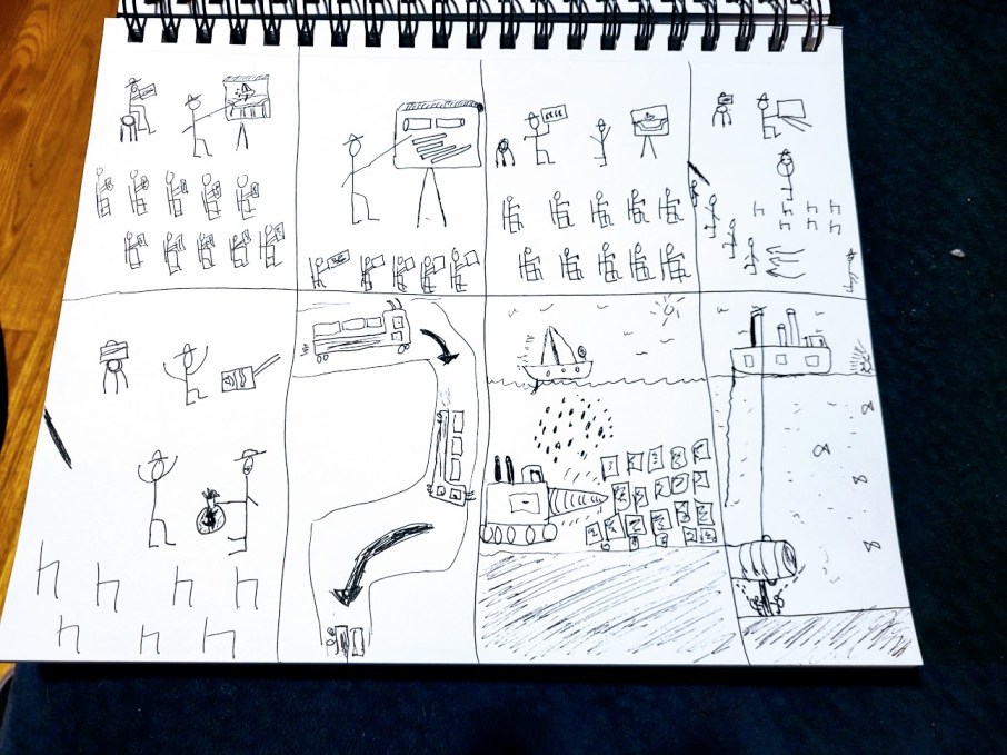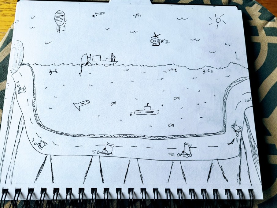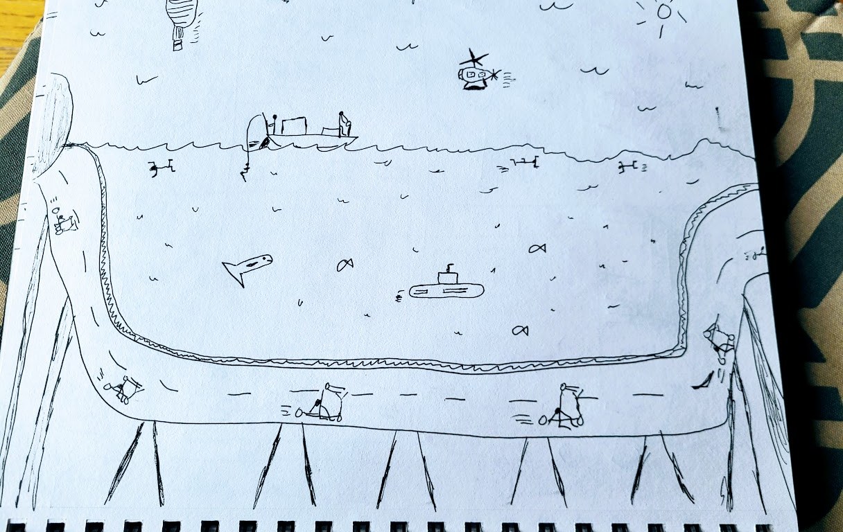 You see, I had a very creative engineering student at the University I taught at in the 1970s who used to chat about underground transportation being the wave of the future. To solve the energy crisis and the traffic congestion on our highways and by-ways, he had this idea that if we built a series of roads and passages and tunnels for common routes, we could help alleviate the congestion problem in cities like Boston (where I lived) and Narragansett, RI (where he grew up). He would draw these elaborate drawings with tunnels and boats and people swimming and try to pitch it to his professors, like me. Here is one of them I kept as a souvenir.
