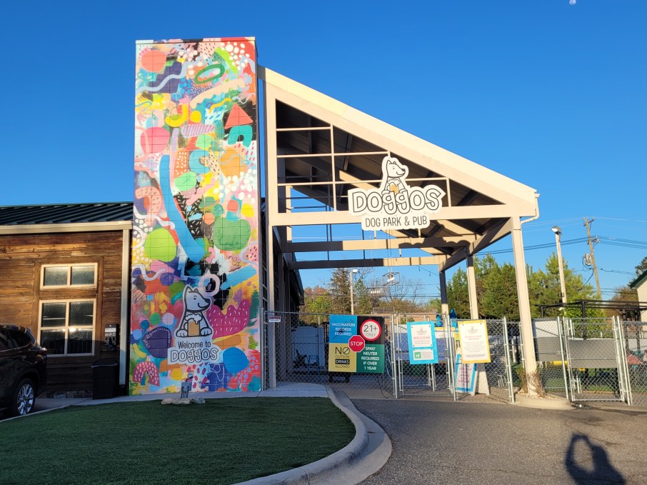 This dog park and brew pub caught our eye as we were leaving the Downtown Greensboro area. Doggos Dog Park and Pub – bring your pup, have a brew, have a hot dog or an appetizer, have an afternoon with your pet. Friendly staff, tons of dogs mingling, cool mural – definitely had to stop into to check this place out!