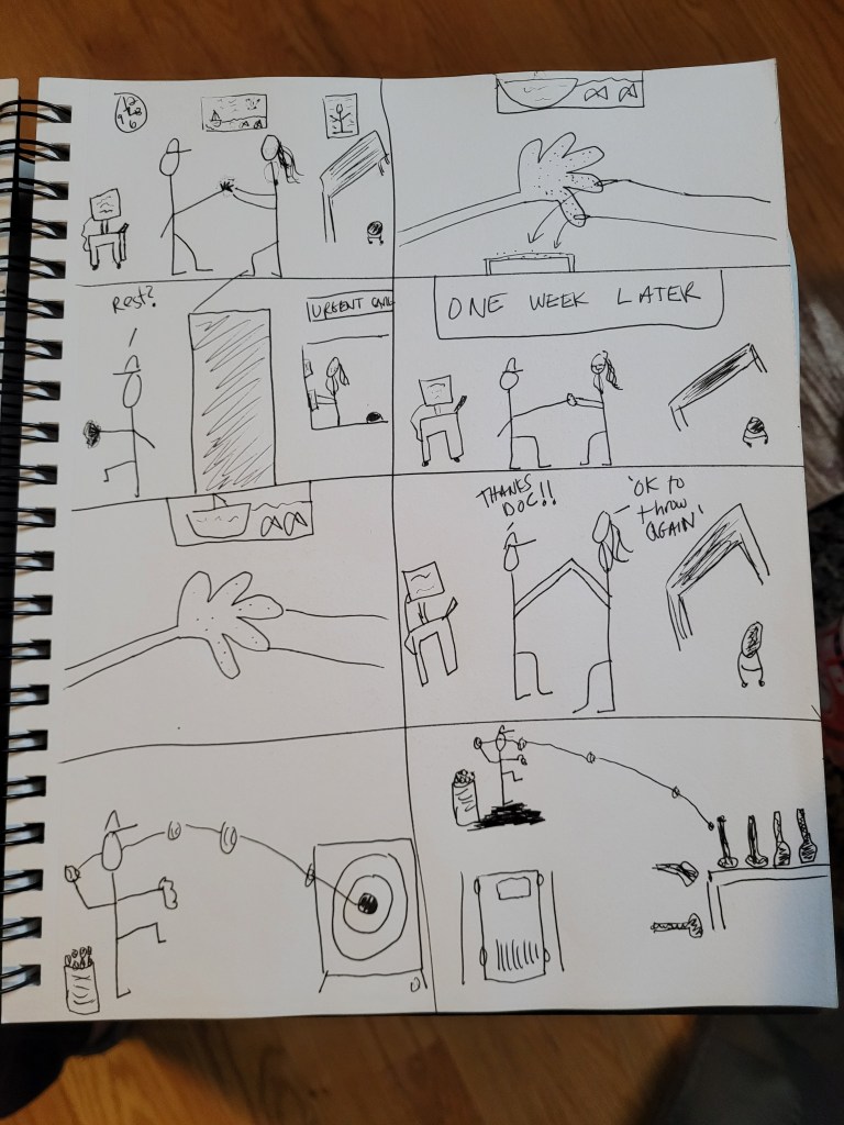 When the nurse was finished pulling out what she could from Dougie’s hand, she wrapped his right hand up in bandages and gave Dougie instructions. “Rest, re-apply this lotion, re-bandage – 7 days Dougie, no activity other than school work.” “But I’m in season, the coach will be so mad,” Dougie exclaimed. “I’ll write you a doctor’s note for baseball and school and gym class. It’s just one week, to help you heal,” assured the nurse. Dougie left the urgent care center with a similar scowl like the one he entered his mom’s car with about an hour ago.