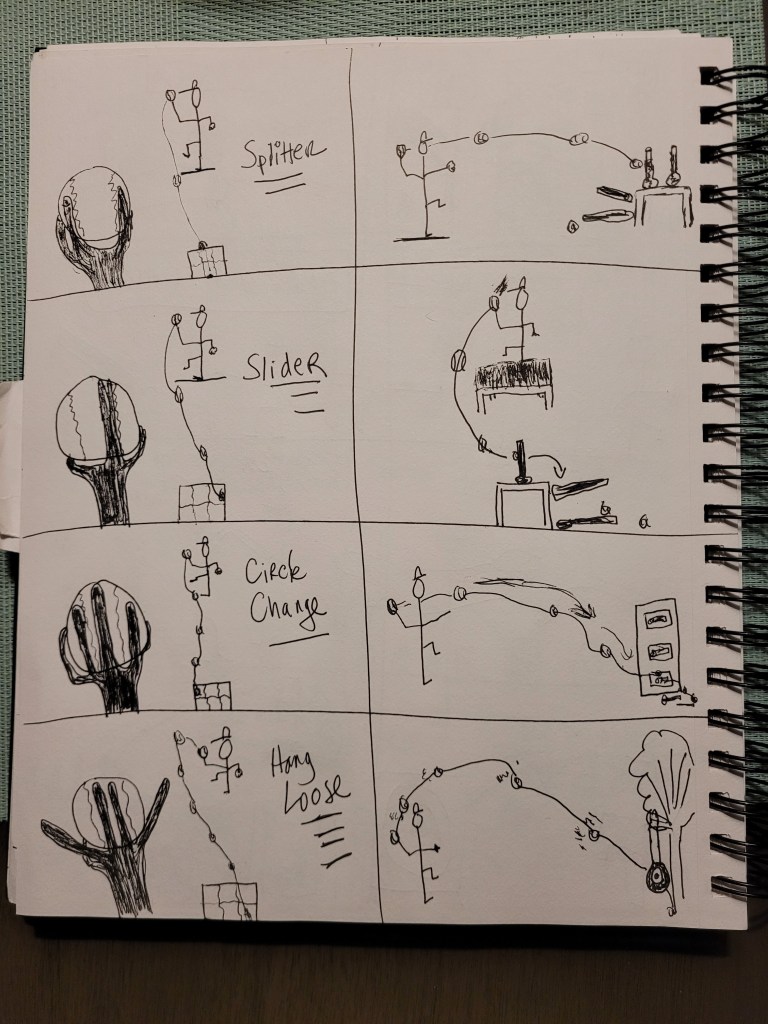 Dougie was super pleased with new pitches and decided to work on a personal inventive pitch. He palmed the baseball with all four fingers and placed his thumb underneath. Then, he lifted up his index and pinky finger like a “hang loose” salute. Then his drew his middle and ring fingers back on the baseball so only the tips of his fingers touched the baseball. He got into his windup, drew his arm back, then released in a flicking motion. The spin off his hand took the baseball on a curve upward, then a spiraling spin downward into the middle target of his pitching target. It was a change up, it was a curve ball, it was a knuckle curve. Dougie named it “Hang Loose.”