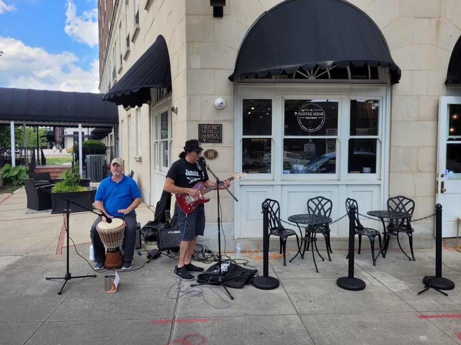 After visiting with Michelle and taking the tour of Segra Stadium, we took a stroll down the famous Hay St to check out the cafes, night light, music, and culture of downtown Fayetteville. I came across this two man band jamming outside a café with their rendition of Lou Reed’s “Walk On The Wild Side.” Pretty smooth groove fellas, nice work. Rachel and I walked the loop and made notes about spots we wanted to stop into later in the day or on the trip. It was a cool downtown area and reminded me of the Providence area known as Wayland Square. It was clean and had a ton of options for dining and shopping.