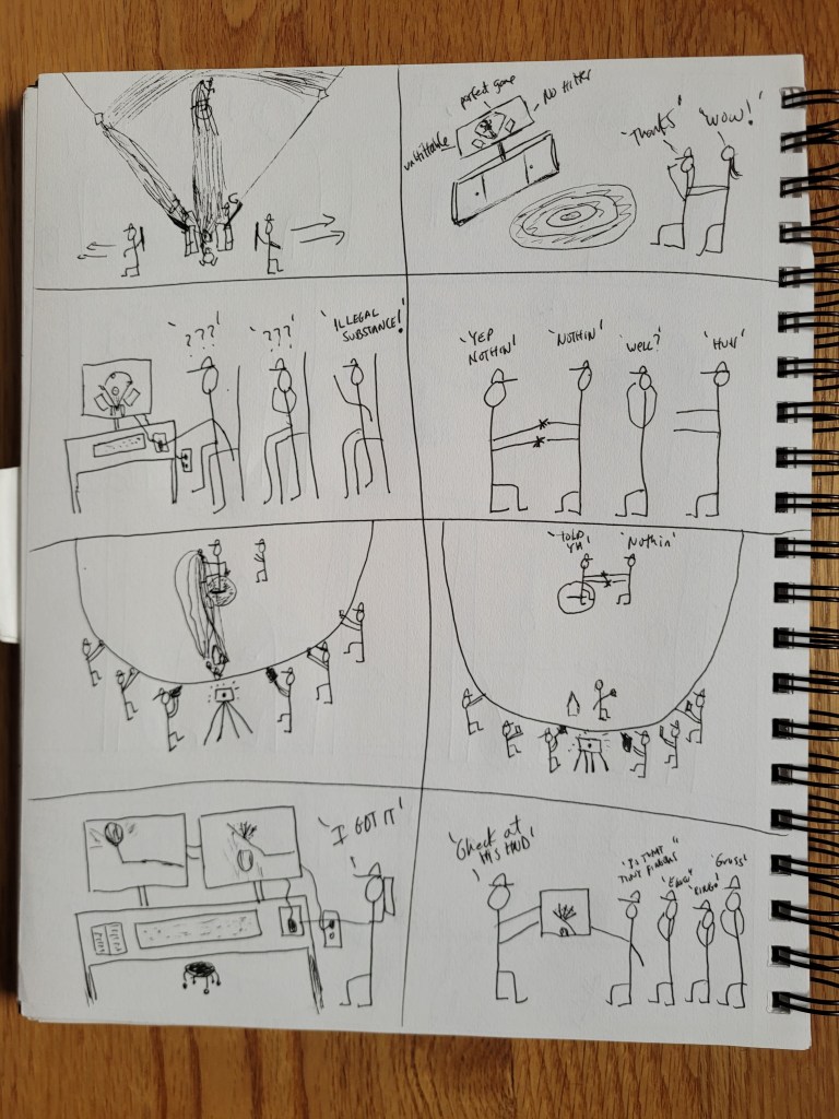 Later that evening, the Bellman coaching group got a call from Ernie Day, a local media rep, who had attended the pitching investigation. He had videotaped the session and was using high resolution replay to check Dougie’s hands, motion, etc. for anything he could report on. “I got it, I got something,” said Ernie Day. “We will be right over,” stated Bellman HC Danny Diekman. When they arrived at Day’s magazine office, Day handed them a tablet with a photo superimposed with Dougie Walsh’s hand. “Look at that,” said Day. “Check out his hand.” The Bellman coaches gasped and gagged and began making comments. “Is that tiny fingers?” and “Bingo” and “Ewwww” and stuff like that. The Bellman coaches felt that they had caught Dougie Walsh cheating and could not wait to report him to the investigation team.