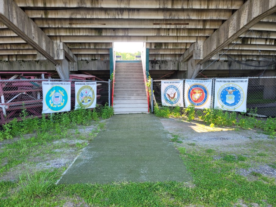 I saw this inviting staircase with military recognition banners and walked up into the stadium to get a fan’s view of the field.