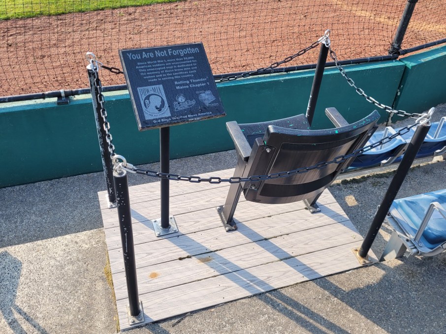 Like many stadiums, a commemorative seat was placed in honor of our fallen or missing military heroes. “You are not forgotten” it reads and the plaque was dedicated by Rolling Thunder, Maine Chapter 1.