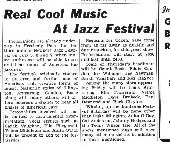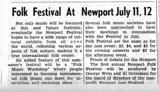 Signs of the times – Newport Folk Festival and Jazz Festival news in their early years. $3 to see Louie Armstrong, Count Basie, and Ella Fitzgerald??? Yes, please.