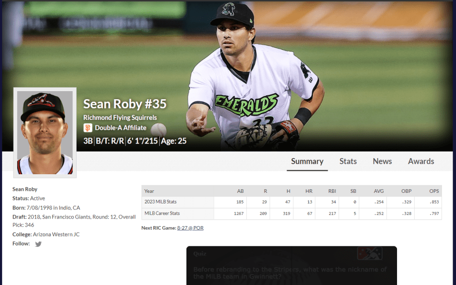 Here is Sean’s bio on MILB. He is currently playing for the Richmond Flying Squirrels, the AA Affiliate of the San Francisco Giants: