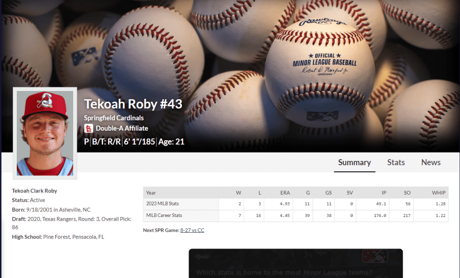 Here is Tekoah’s bio on MILB. He is currently playing for the Springfield Cardinals, the AA Affiliate of the St. Louis Cardinals:
