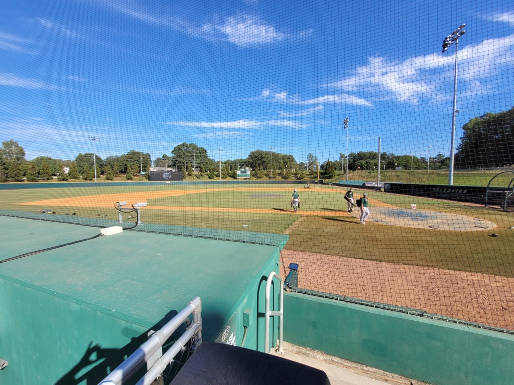 From what I could find on the facilities on the Georgia Gwinnett College Athletics page, this facility and its surrounding fields were built just 10 years ago. Again first impression – it looked like it was built last month. Absolutely amazing view walking up to the Grizzly Field. I found my way down a sidewalk to the bleacher area and saw that practice (just the Gwinnett players) was just about wrapping up. Players were gathering their bags, equipment, and beginning to rake and dress the field. As I walked towards the players, a head coach looking manager addressed me with a warm hello. I told him why I was there, that I was traveling for business, and love visiting and writing about baseball fields. He said welcome and by all means, take some photos.
