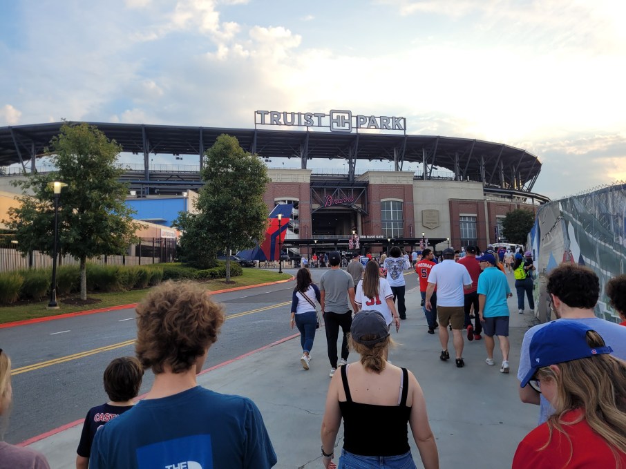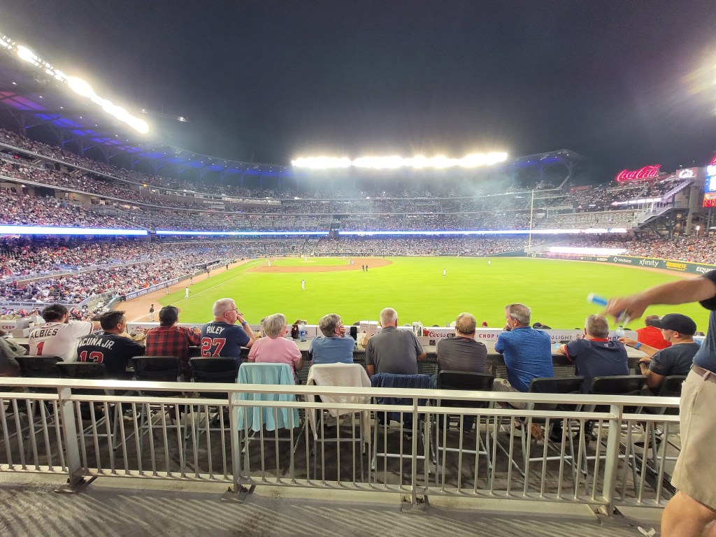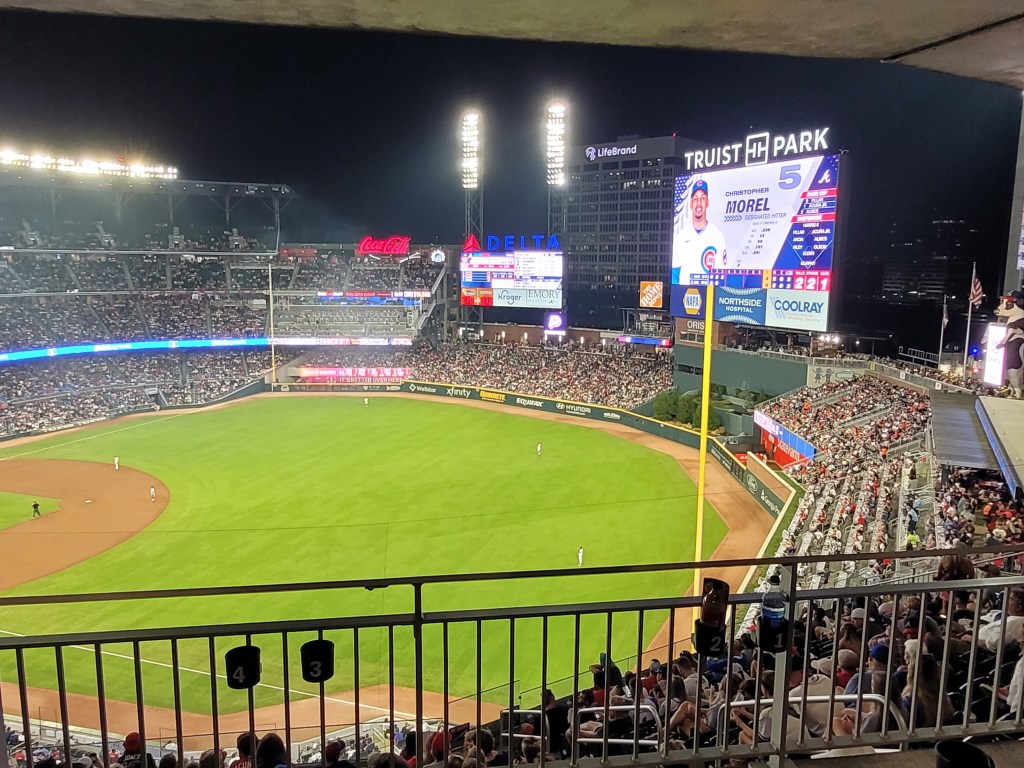 On my recent trip to Lawrenceville, GA for ABF Freight, myself and two other work friends decided to take in the sites and sounds of Truist Park for Atlanta Braves baseball. Atlanta is having a historic year in terms of fans (3 million of them), players (how much time do you have), and the entire organization (first place by like 50 games). So, getting a chance to see the Braves and a potential Wild Card opponent in the playoffs (at game time Cubs were still in the WC race) was absolutely amazing. The weather cooperated, tickets were very reasonable through my friend’s ticket app, parked near the stadium, everyone was baseball ready for the game. Here is a photo recap of my trip to Truist Park, Atlanta, Georgia.
