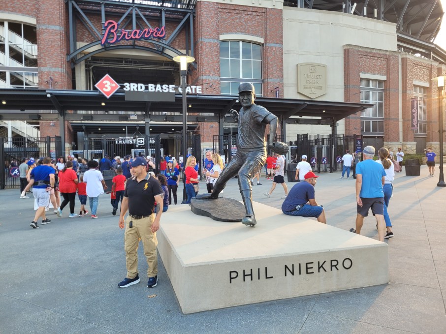 As I stated earlier, easy to find parking, we parked less than a mile from Truist Park, a bit of traffic but that is expected in the busy urban areas of Atlanta. Nice walk up and over I-75 to the 3rd base gate. A familiar Braves legend was awaiting us and greeted fans outside the stadium.