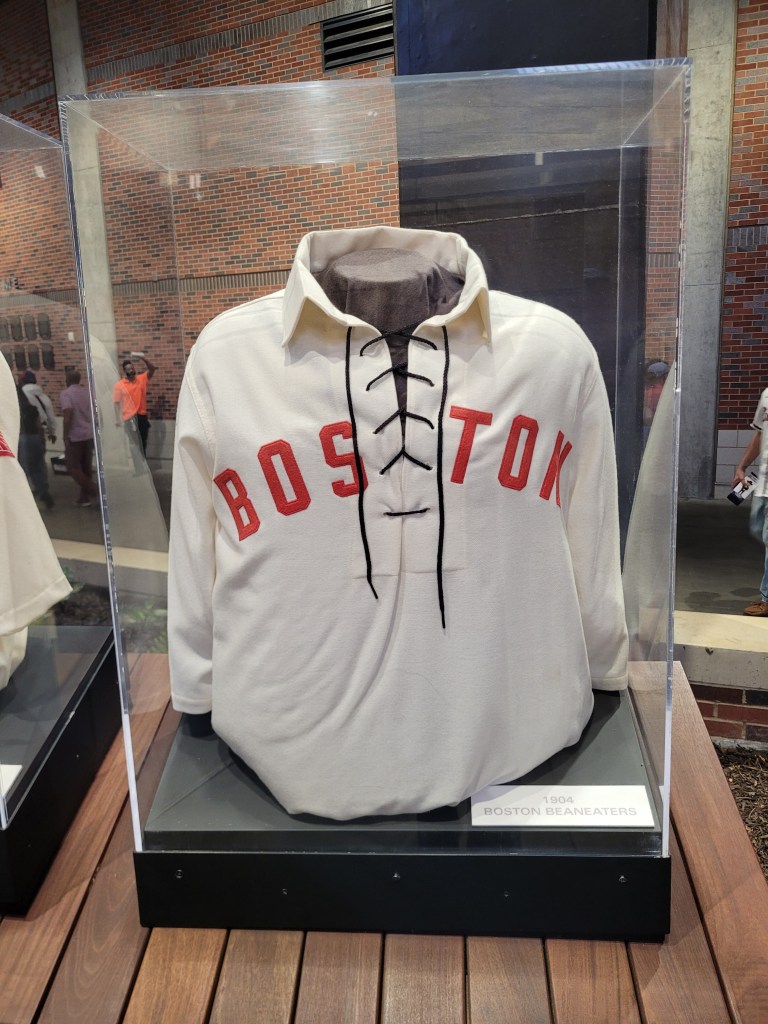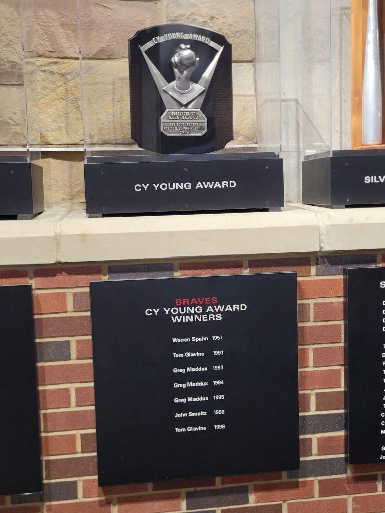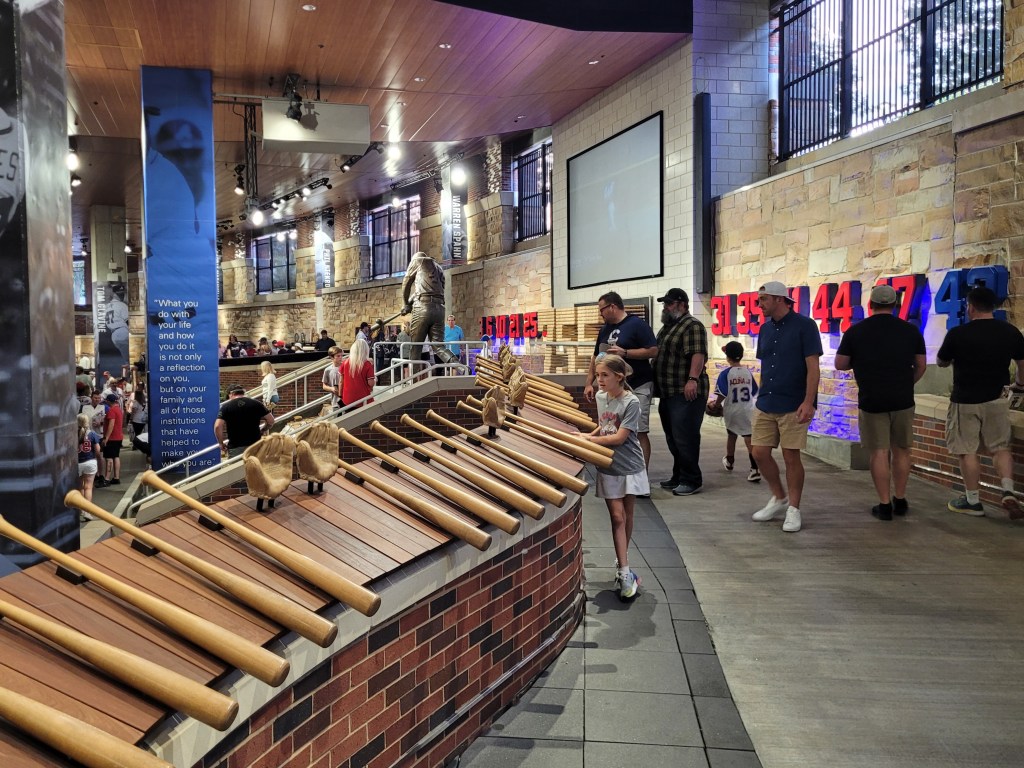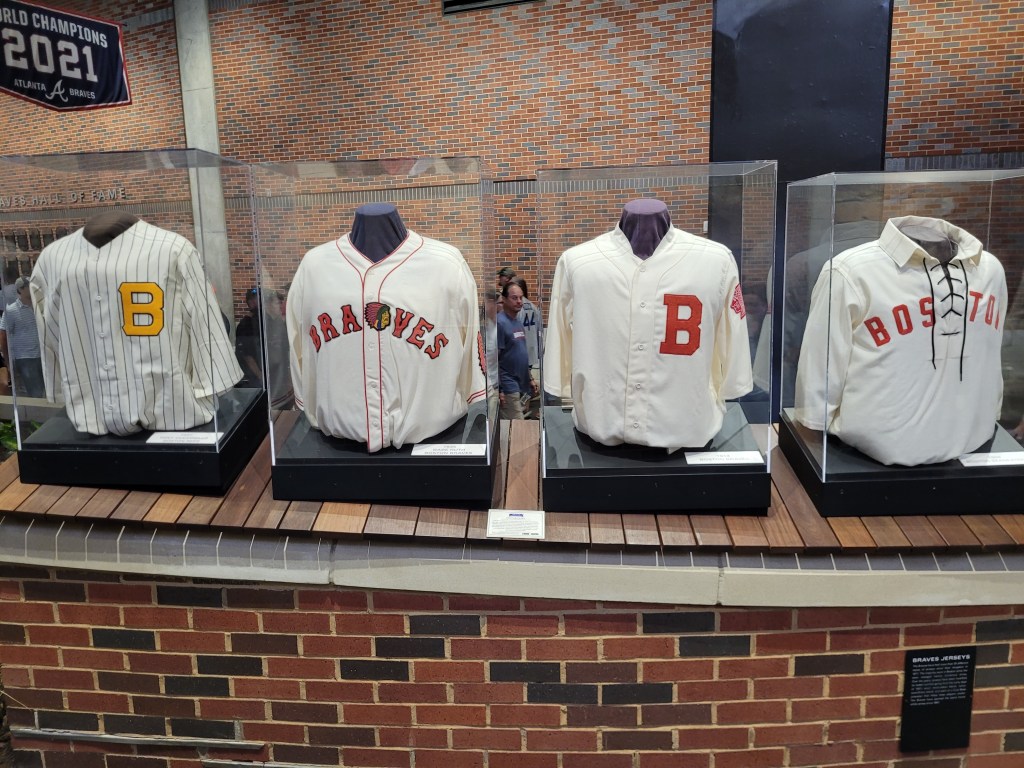The 3 of us arrived about 1 hour prior to game time, so we took the time and walked the concourse. It didn’t take too long to find the Atlanta Braves Hall of Fame plaques, huge dedication area to the Boston and Milwaukee Braves, beautiful display honoring the late, great Henry Aaron, and all the amazing players who have donned the Braves uniform over the years. Here are some photos I captured in this very, very impressive Braves tribute area (one of the most impressive baseball collections since going to Cooperstown):