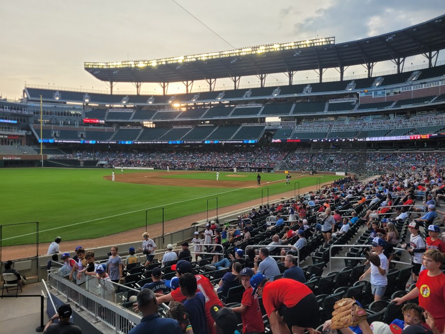 After about 7 innings of home runs, watching about 12 pitchers on strict pitch counts throwing live, fans cheering loudly on every play, the game was announced – over. Fans stayed for players to say hi as they walked to the dugout. Kids got to maneuver for a few more baseballs being tossed in the stands. Joe and I stayed for a bit to let the crowd disperse before heading back to our car. Overall, a really fun night at Truist Park.