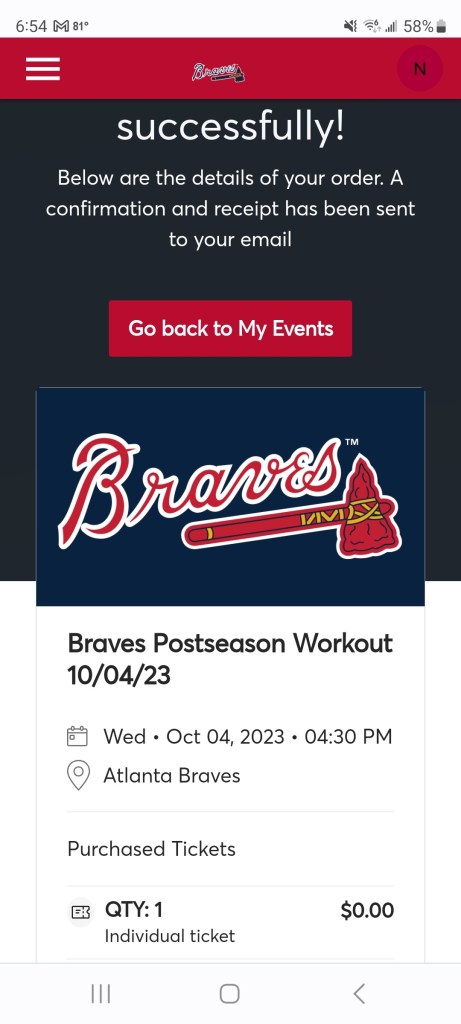 Per the Braves website, I was to log into my Ticketmaster account and purchase a ticket for $0. Sounds good to me and with a few clicks, I was all set for a free event at Truist Park. Free parking, free general admission, what an amazing opportunity for Braves (and baseball) fans. A work colleague of mine, (Joe, Dodgers fan) joined me for the event and after a busy day at work (for ABF Freight), we hopped in the uber-busy Atlanta traffic and headed south to Truist Park.