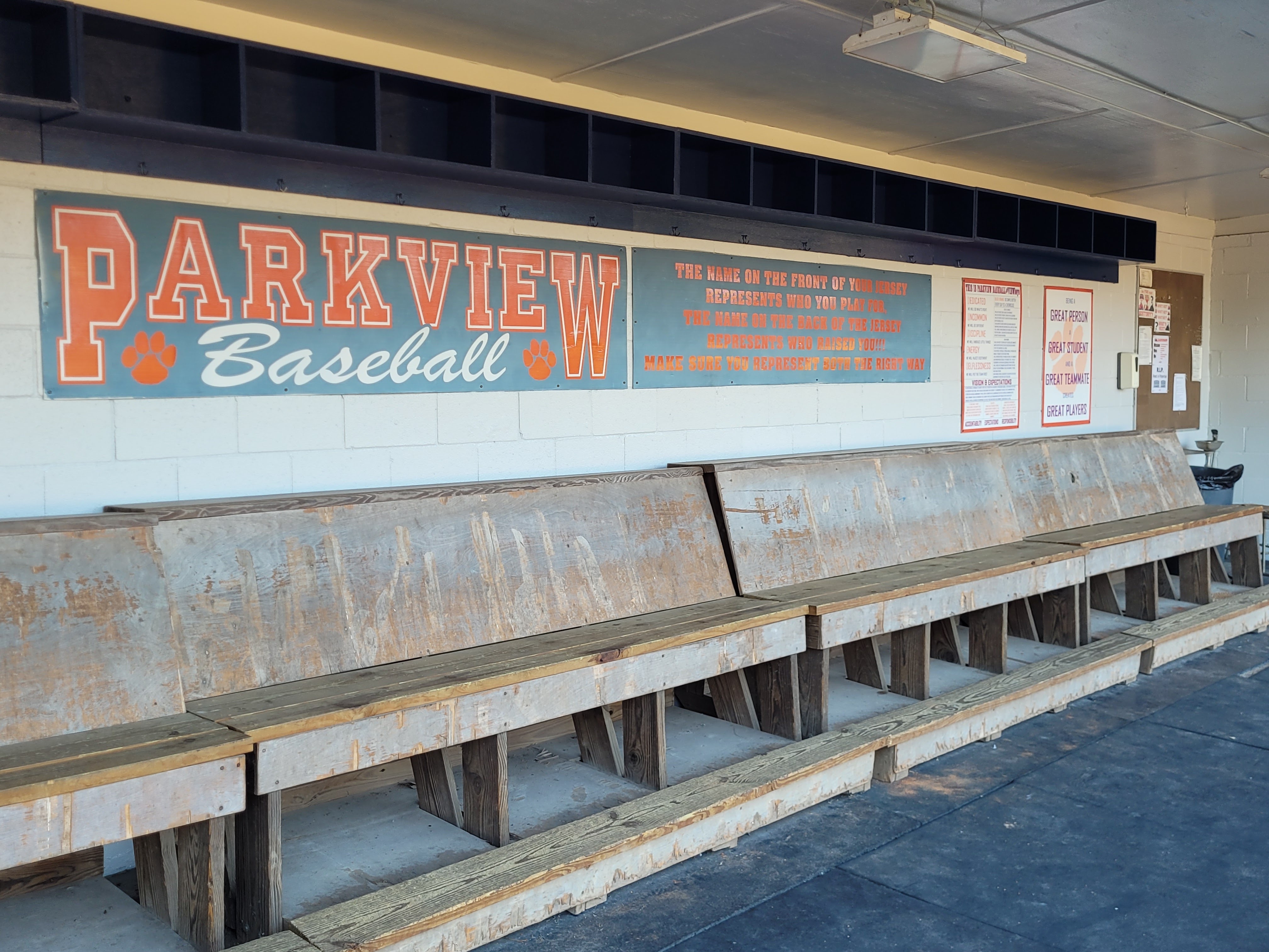 As I walked up to the entrance gate, there was another man inside the stadium area reading all of Parkview’s accolades. “Pretty impressive, wouldn’t you say?” he asked me as I approached him and the field and the rows of state title banners. “From the looks of it,” I chimed in, “these guys are pretty good at baseball.” I got a chuckle out of the man, who was a bus driver for a visiting school playing Parkview on an adjacent field. The bleachers, as you can see from photo above, were peppered with sponsors. The clubhouse was peppered with state title banners. This was going to be a cool baseball experience and adventure at Parkview.